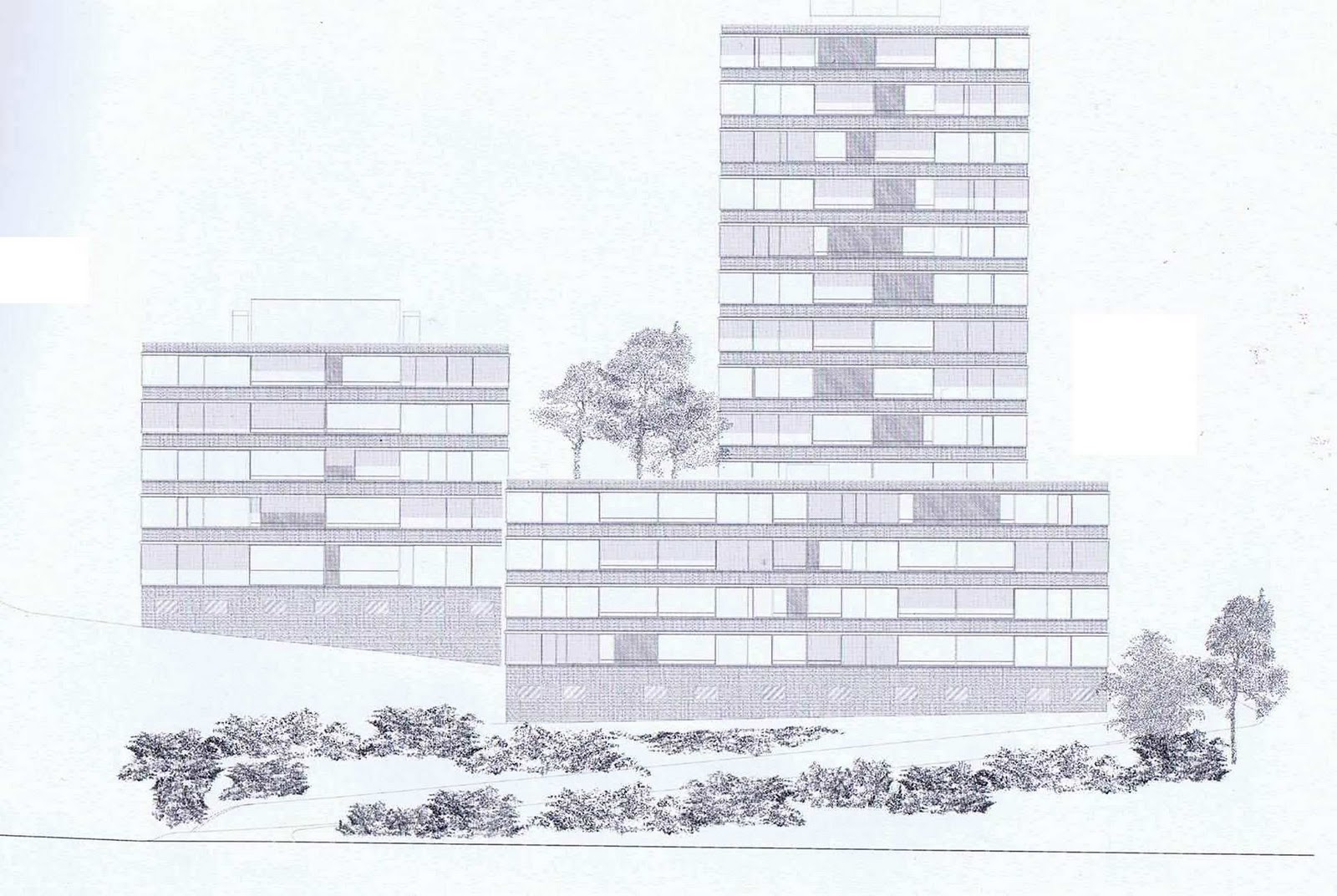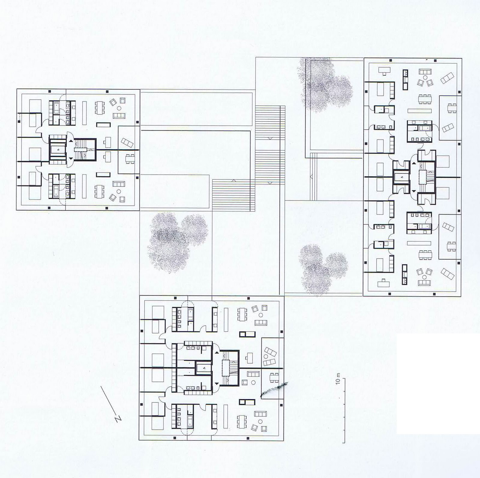 Un proyecto de vivienda formado por tres piezas a dos viviendas por rellano que establecen un juego de relación tanto a nivel de planta donde crean unas plataformas que sirven de acceso a las viviendas como en sección con una variación de alturas permite entender la unidad del conjunto y las relaciones que establecen entre sí los distintos volúmenes.