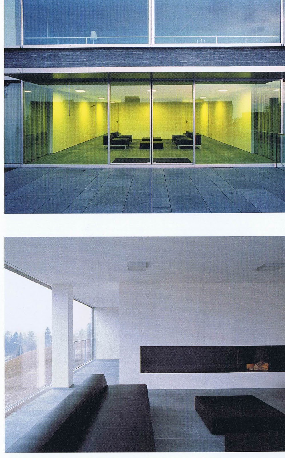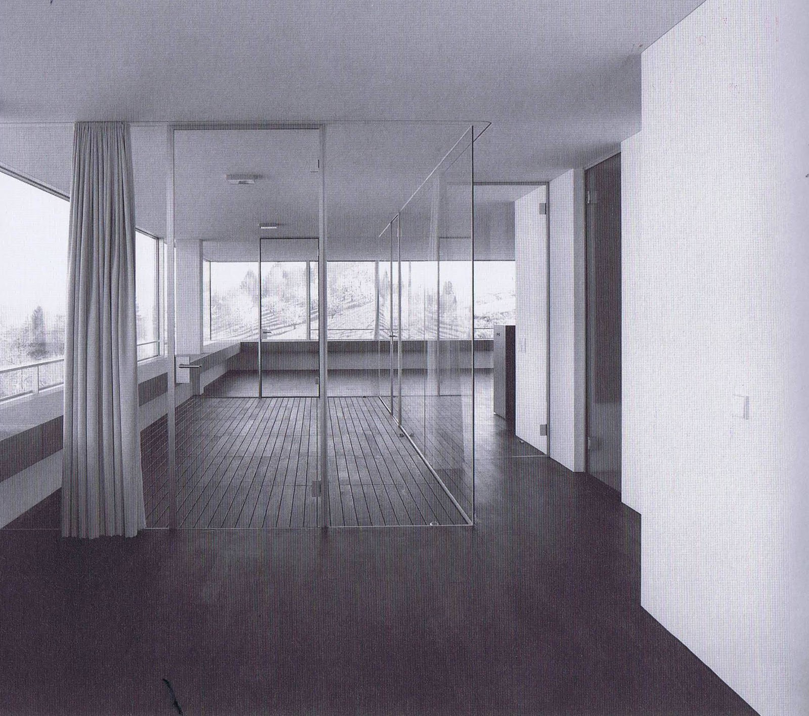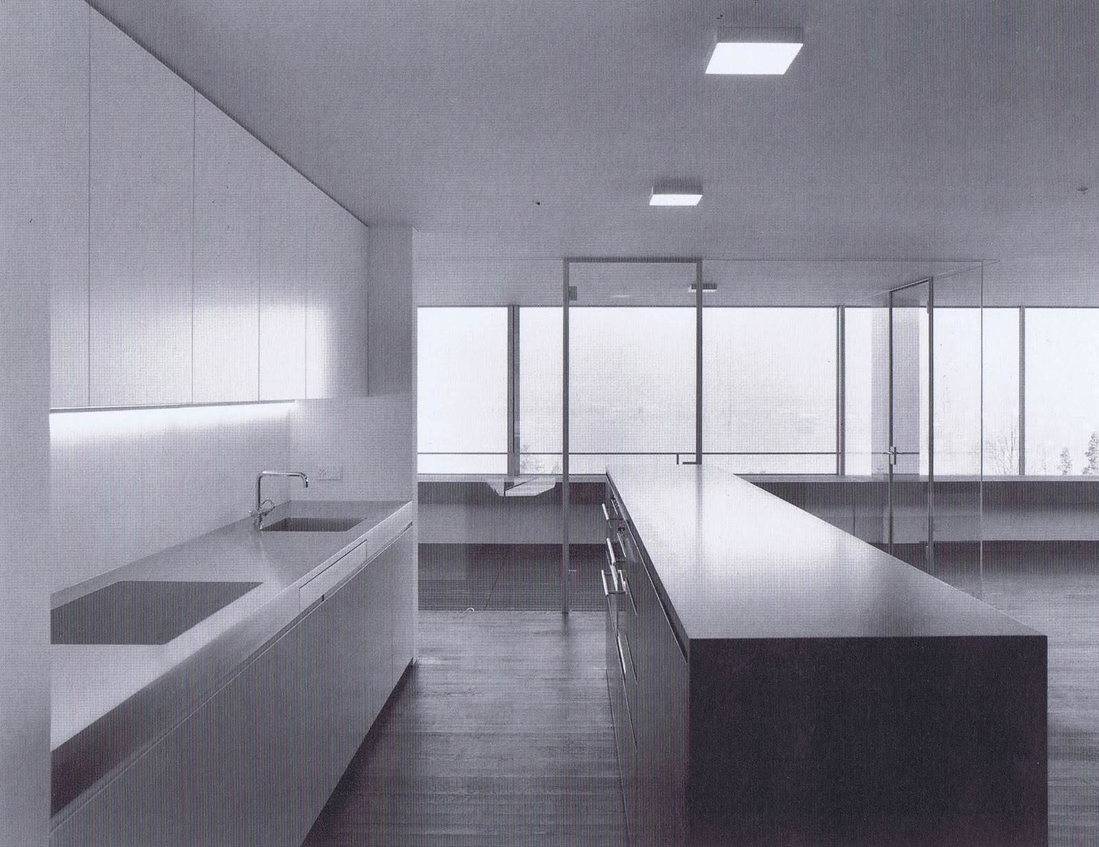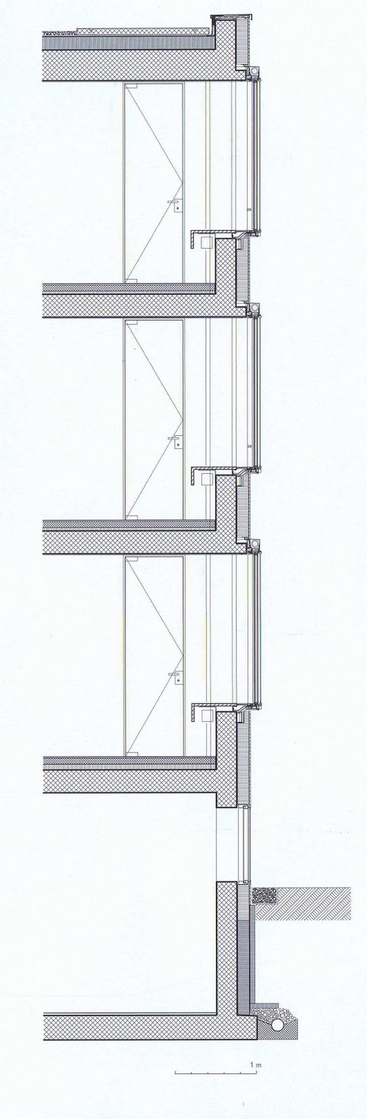 En alzado consiguen una relación muy horizontal, tanto el macizo como el vacío rodean por completo las piezas, que se relacionan mediante las cotas de los forjados. El detalle constructivo muy pulido nos muestra el interés de este punto, donde se ha tenido la precaución de liberar la esquina del pilar situándolo dentro de la vivienda y dando cierto grosor a la fachada para situar piezas de instalaciones en la parte interior y una finísima protección solar en la exterior. Pero al igual que en el caso de la “terraza interior”, este proyecto tiene la virtud de no esconder nada, los pilares tras los grandes ventanales son la única línea de verticalidad que al estar pintados de blanco vuelven a situarse en el grosor de fachada, entre el dentro y el fuera.