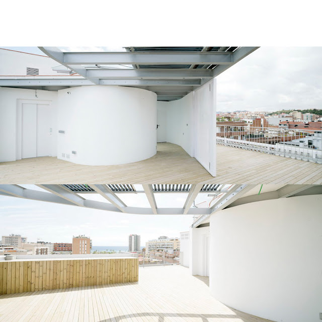 La escalera en espiral es también un sitio de estar, bien iluminado y de circulación entre las diferentes viviendas. La tipología es compacta y pasante. La sala de estar da a las dos fachadas y deja en sus laterales los flexibles cerramientos que delimitan las habitaciones y a continuación, las cámaras higiénicas, con revestimiento cerámico en paredes y suelo. La cubierta es un espacio de relación con la ciudad y el mar con una marcada tendencia lúdica.