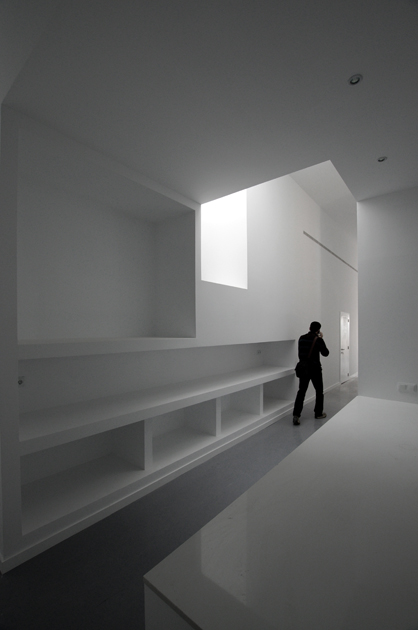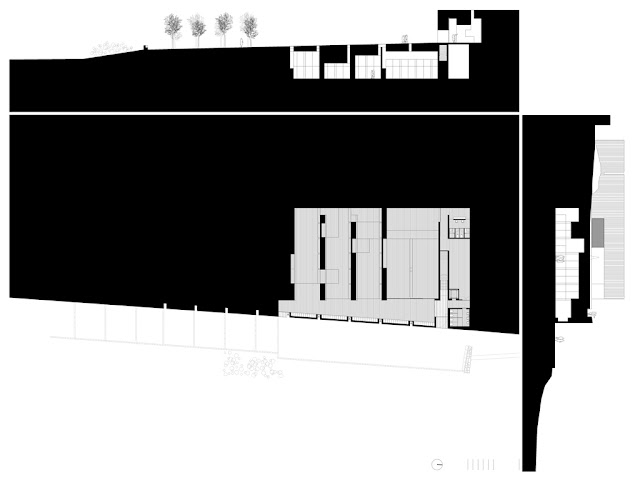 D’altra banda el poble es composa de petites crugies. Aquestes crugies defineixen cases. Cases que estan contingudes entre dos murs mitgers perpendiculars al carrer, construïts en pedra i de gran amplada. Així mateix succeeix en el nostre edifici. S’ordena a partir de petites crugies una al costat de l’altra. Seguint la pauta. Murs de formigó d’un metre d’amplada col·locats en paral·lel i separats sis metres. Aquests murs configuren l’espai, ordenen les instal·lacions, són entrades de llum natural. La seqüència es marca sobre la plaça mitjançant talls de llum. L’edifici és hermètic, tancat, opac, cec. Només unes petites fissures ens permetran entrar al seu interior. Quan baixem a la planta baixa veurem com la llum juga amb la pauta de les mitgeres. Per un costat entra tangent al mur, mostra tota la seva dimensió, el perfila. De l’altre costat el posa a contrallum, retallant-hi un gran forat que permet a la llum entrar més intensa, concentrada i puntual.