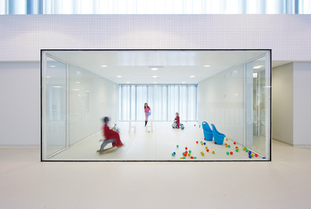 Tanto la organización del espacio interior de las aulas como el diseño del mobiliario han tenido en cuenta la distinta percepción espacial de los pequeños y de sus educadores: Por un lado, las actividades de los niños se organizan en base a una serie de “rincones” temáticos adaptados a su escala, donde pueden desarrollar de modo flexible diferentes actividades, evitando la aparición de espacios enormes o inadaptados al trabajo en grupos de distinto tamaño. Por otro lado, los educadores deben poder tener control visual de los pequeños desde cualquier punto del aula.
