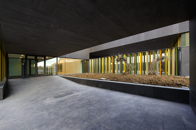La fachada oeste del edificio se protege de la incidencia directa del sol de tarde mediante una celosía estructural de lamas verticales conformada por pilares de acero de sección romboidal.