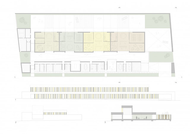 Decidimos organizar el edificio como una secuencia de cuatro cuerpos paralelos que alternan cuerpos “edificados” con espacios vacíos.