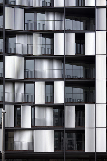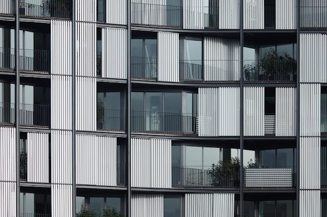 Las fachadas cuentan con una serie de elementos metálicos que permiten cubrir las zonas acristaladas para cuando se requiera intimidad, ya que las viviendas carecen de persianas, pero permiten que pase la luz y que se siga gozando de las vistas desde el interior.