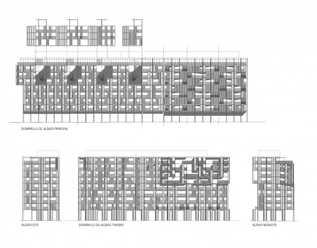 El proyecto plantea una óptima orientación en la disposición de las viviendas, que permite la ventilación cruzada y una mayor superficie de iluminación natural. Existe también una gran versatilidad tipológica en la proposición de las mismas – 1, 2 y 3 dormitorios-, dependiendo de si son viviendas simples o dúplex.