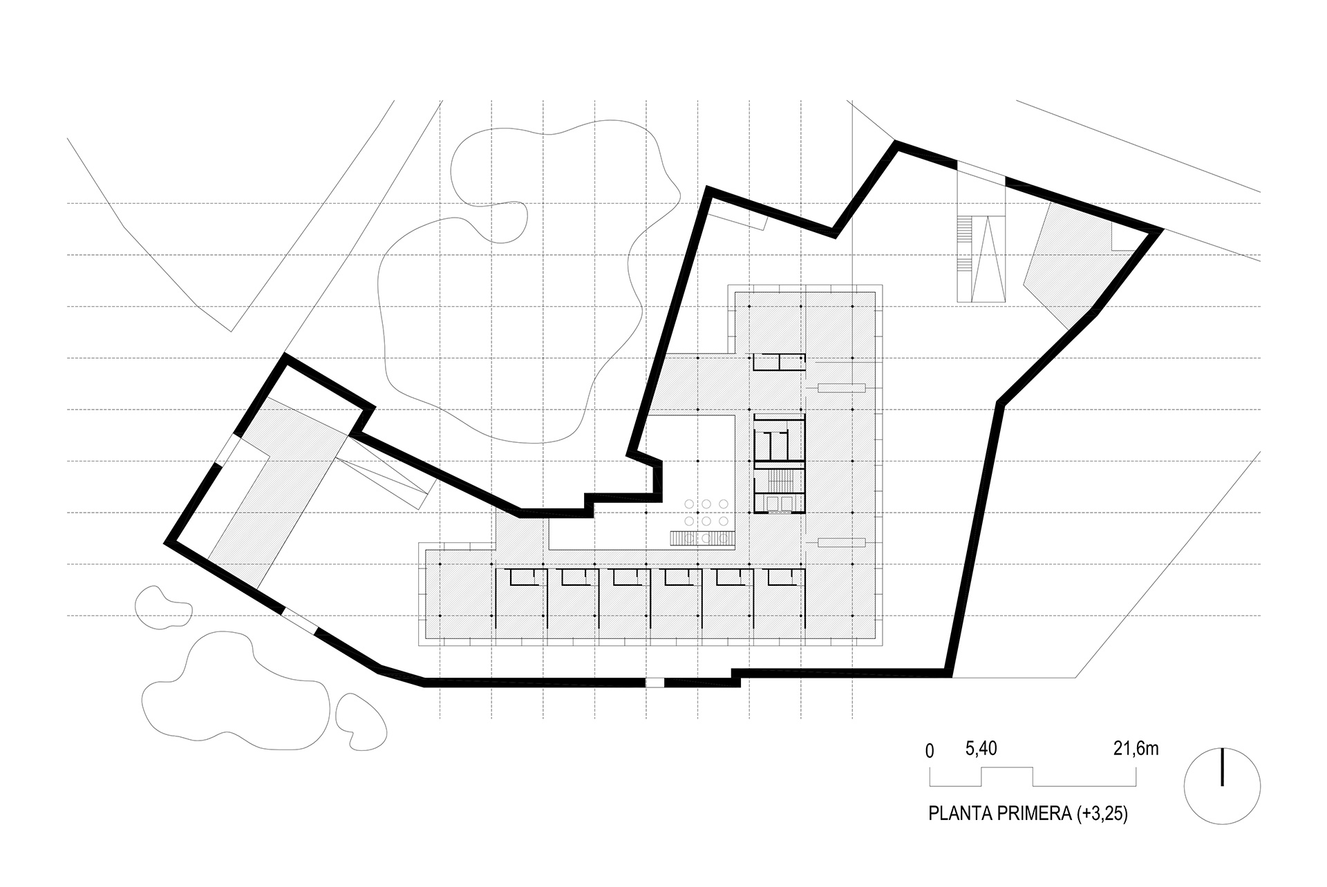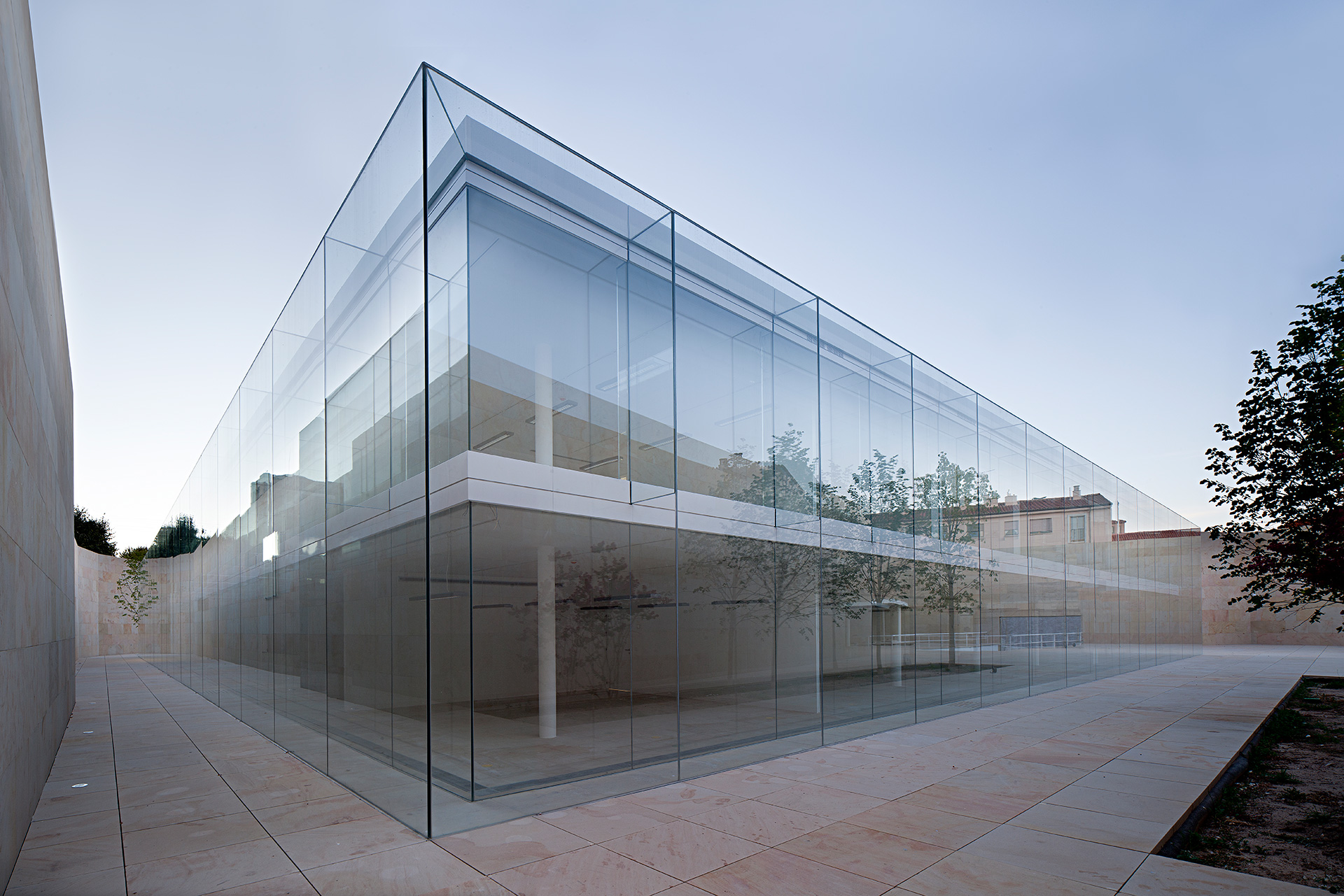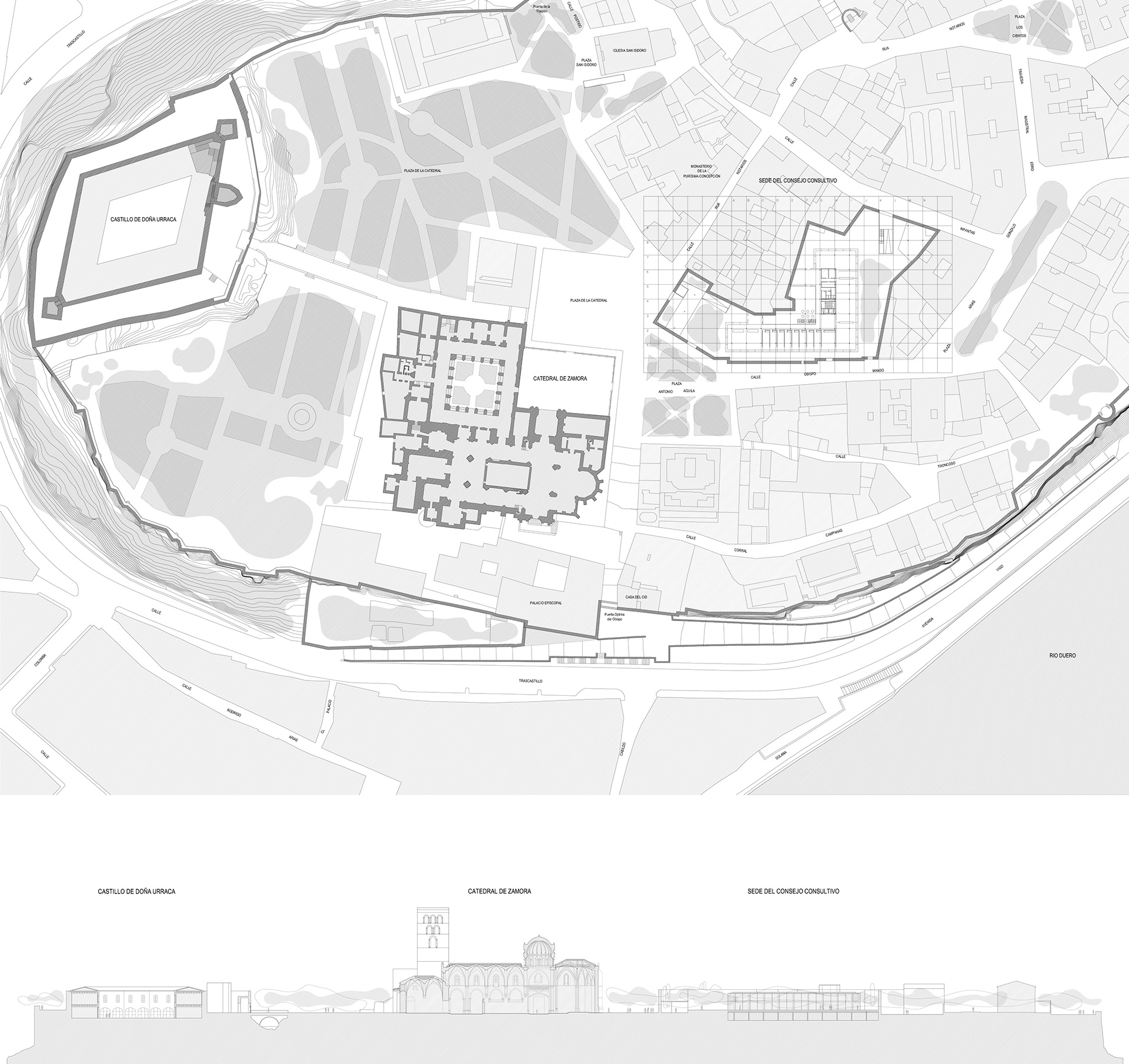 La estrategia de integración es : estamos en el casco antiguo precioso de Zamora, y queremos enclaustrar al edificio tras un muro de 4 metros, creando no un patio sino una calle paralela, angosta, como decorado de una caja de cristal (protagonista de este espacio sordo y ciego como no puede ser de otra manera)en la cual este verano hemos asado lechones sin combustible…después apareceran miles de metros cuadrados de estores (a precio de alto cargo) para salvar el entuerto…Glorioso