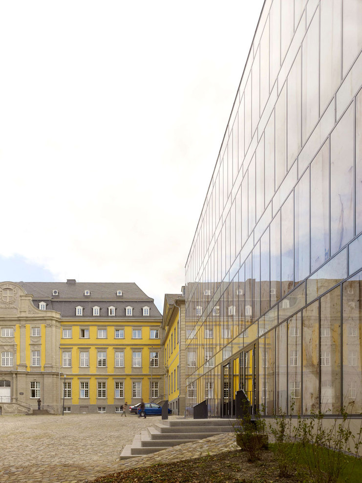 In 1811, while under French occupation, a prison was set up in Werden Abbey. The Prussians extended this and erected a hospital building on the south side of the courtyard. Upon the demolition of the hospital building, the remaining ensemble of buildings looked unbalanced. Without reproducing the original shape of the prison, the new building encloses this side of the courtyard with its voluminous crystalline structure. The new building’s eastern side adjoins the so-called administrative wing of the old abbey. The volume of the new building corresponds approximately to that of the Prussian wing across the courtyard.
