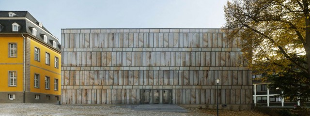 Folkwang University of the Arts is North Rhine Westphalia’s college of art and music. Its main campus is housed in the former Benedictine abbey of St. Ludgerus in Essen-Werden, situated in the southern Ruhr Valley. The small 8th century site was extended into a princely baroque residence in the 18th century, arranged around a magnificent courtyard (Cour d’honneur). The construction of the new library on the south side of the courtyard by the architect Max Dudler replaces a 19th century military hospital building demolished in 1969. In 2006 Max Dudler won the design competition organised by the Duisburg branch of the Building and Real Estate Management Authority, North Rhine Westphalia. The project was generously supported by the Alfried Krupp von Bohlen und Halbach Foundation.