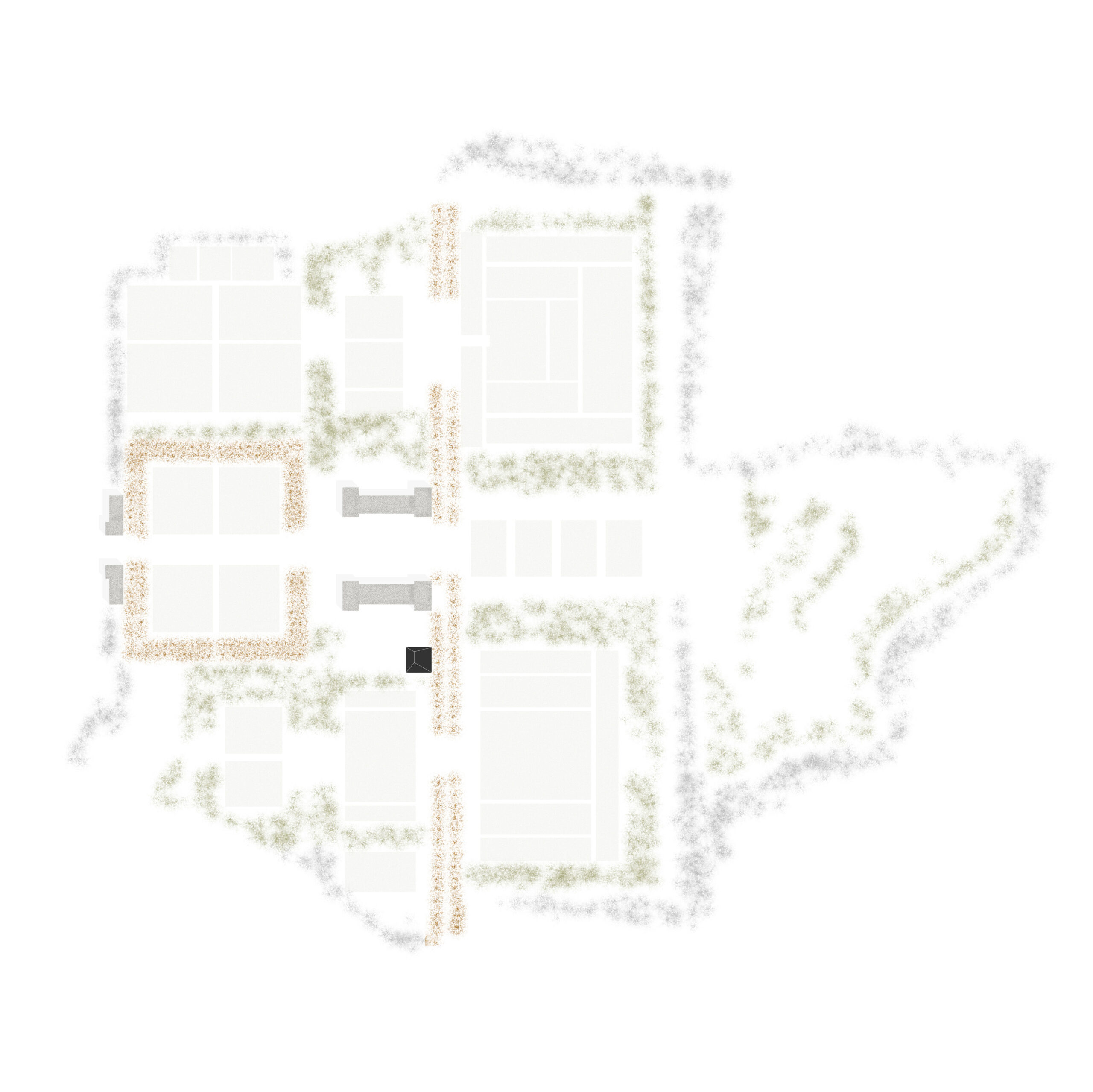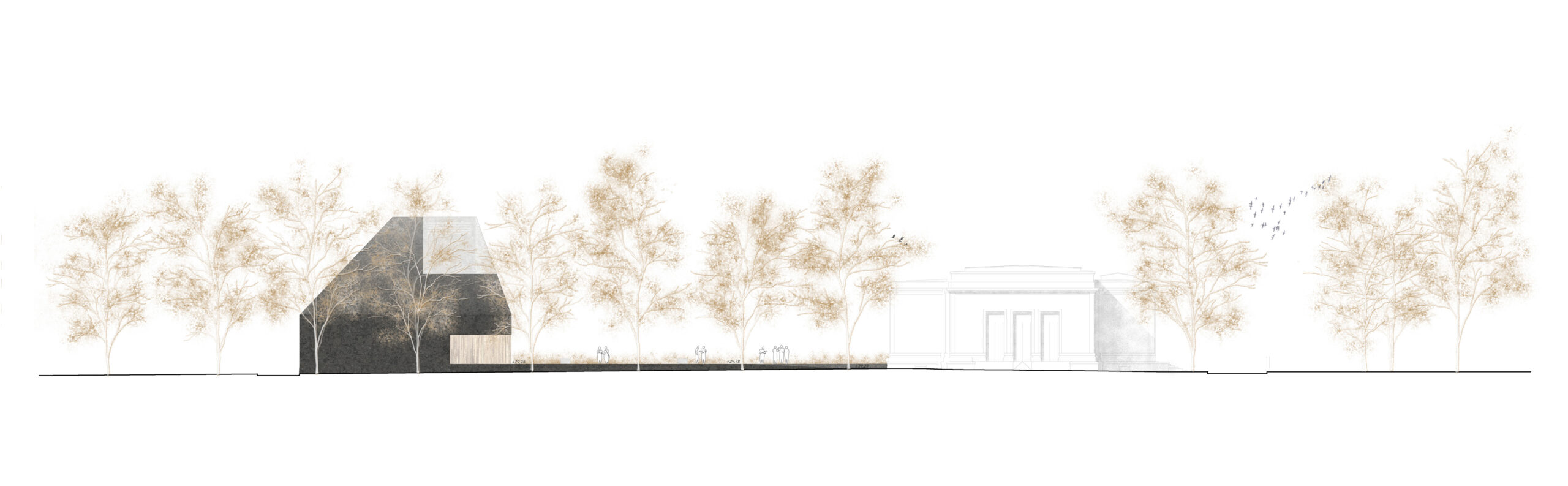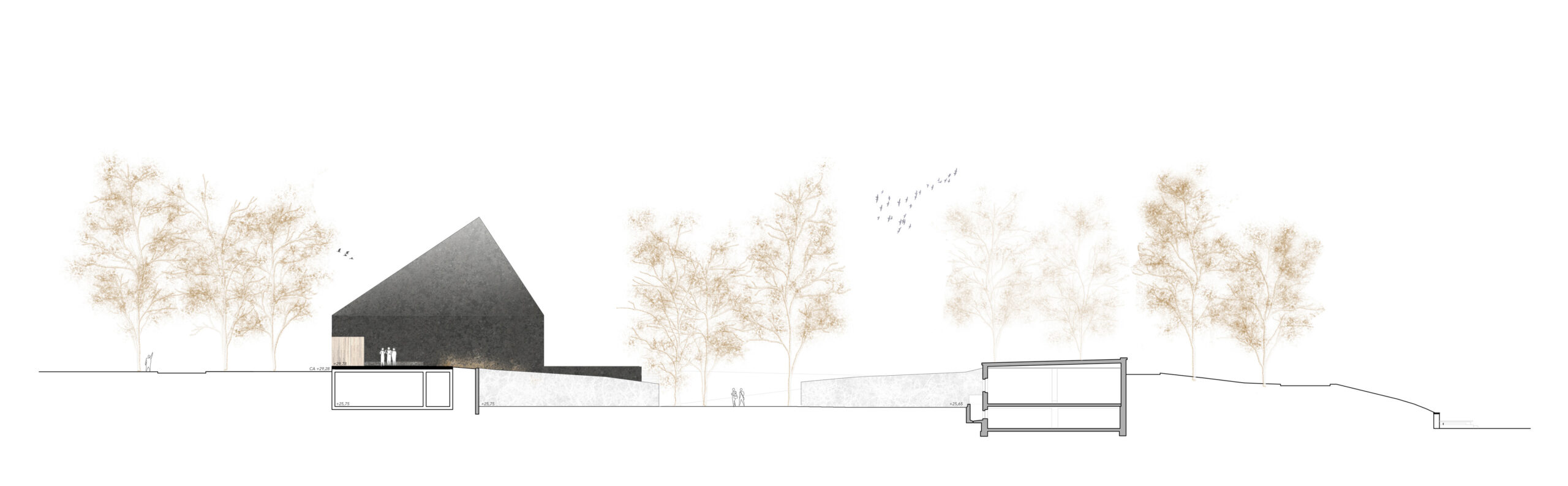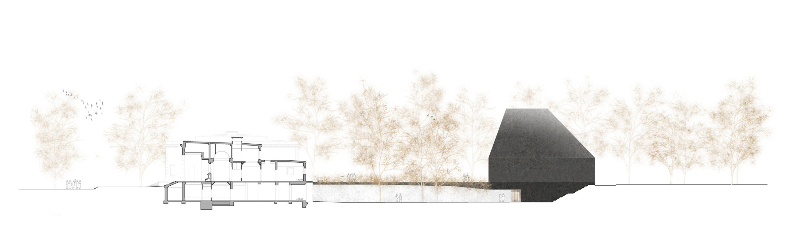 In this way the new building appears as an independent and representative piece, isolated among the trees. The covering material, polished black concrete, allows the trees’ girths and shadows be “tattooed” into the building skin, putting it into context.
