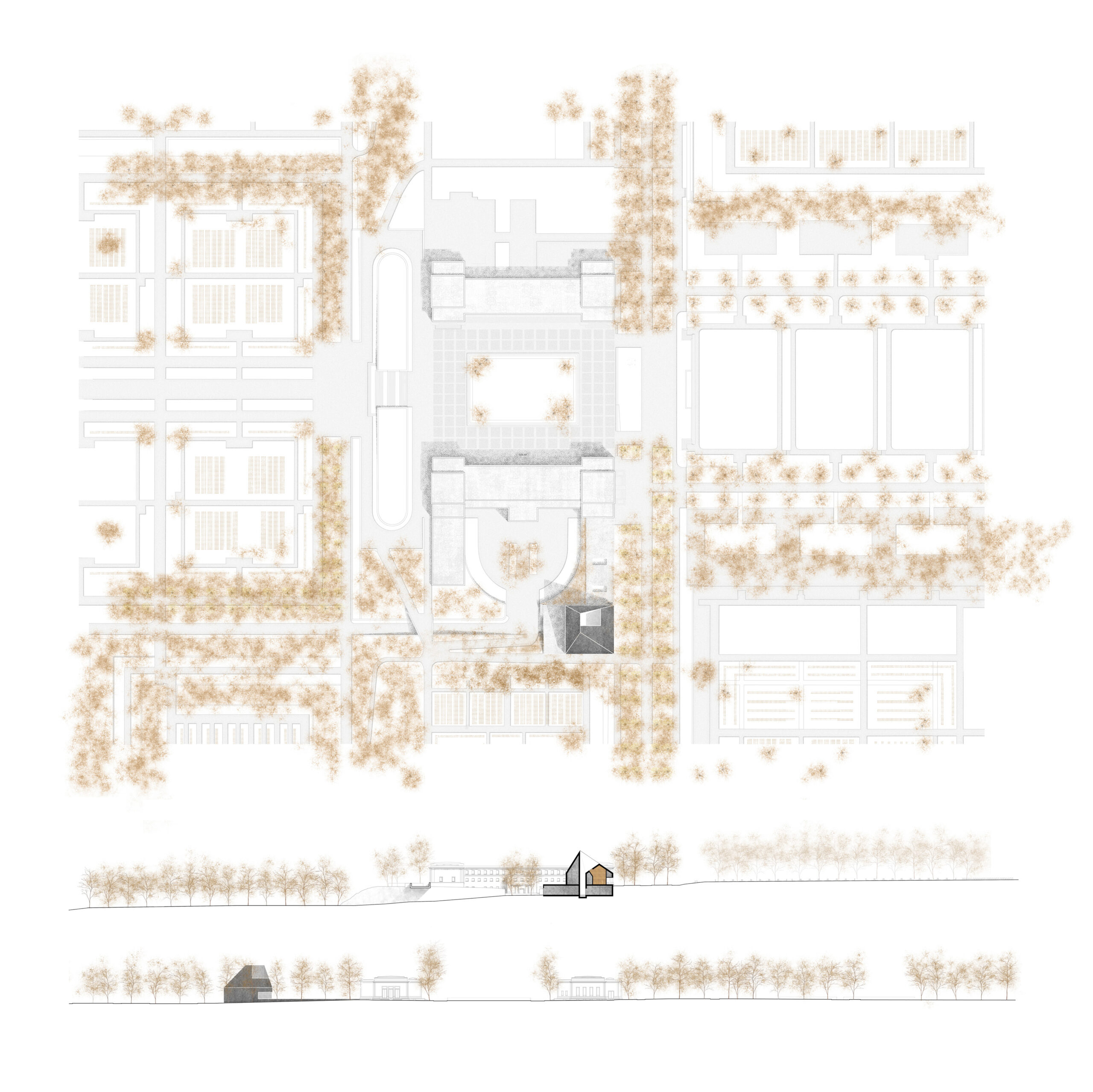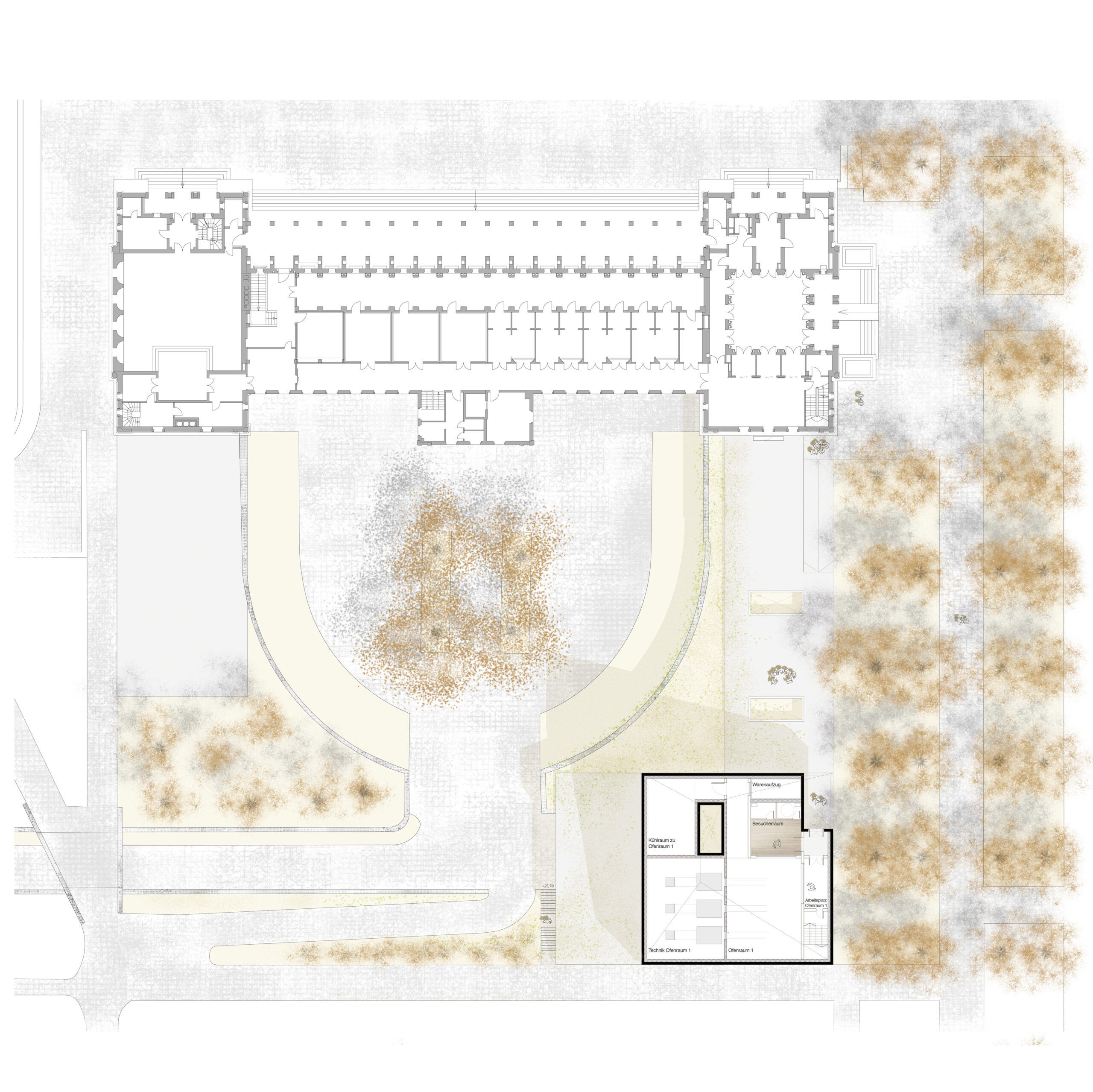 This “empty-built” space between the two buildings, the existing one and the new one, becomes the entry square because of their connection in the underground level.