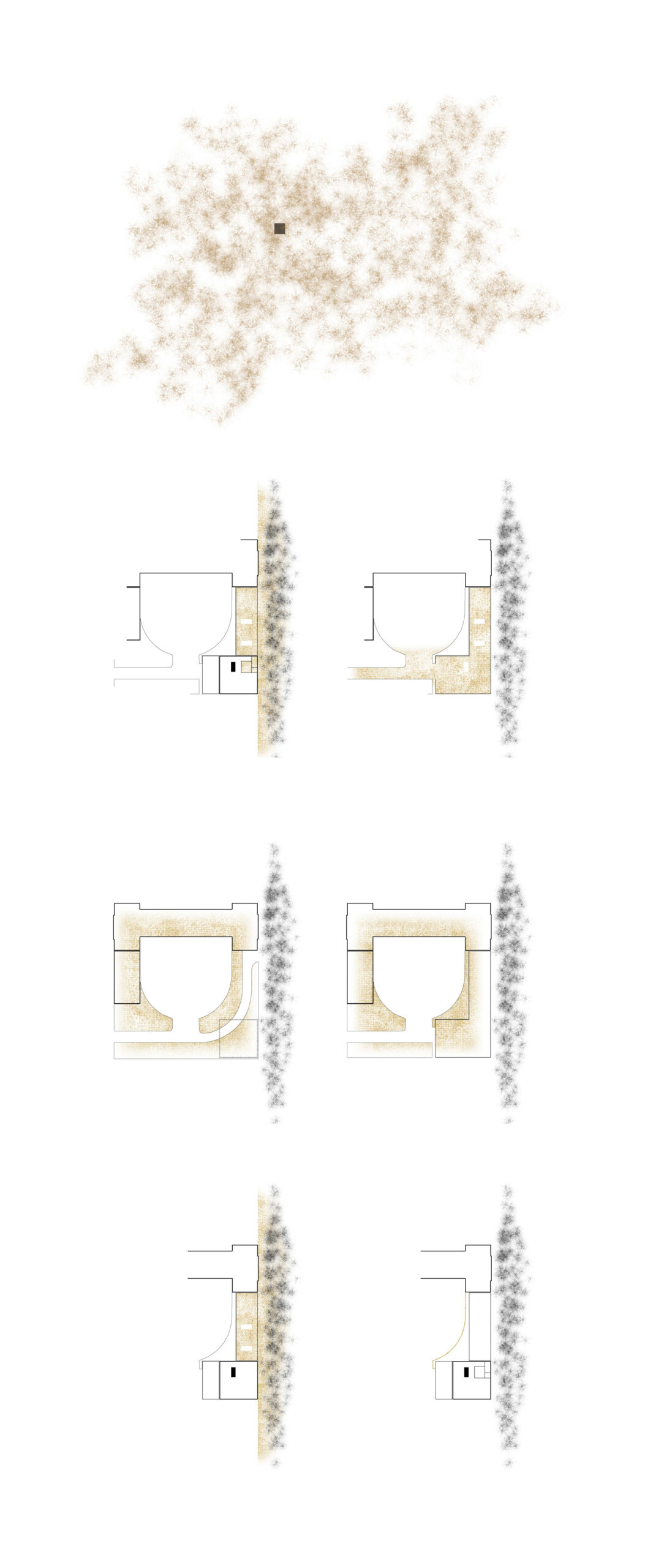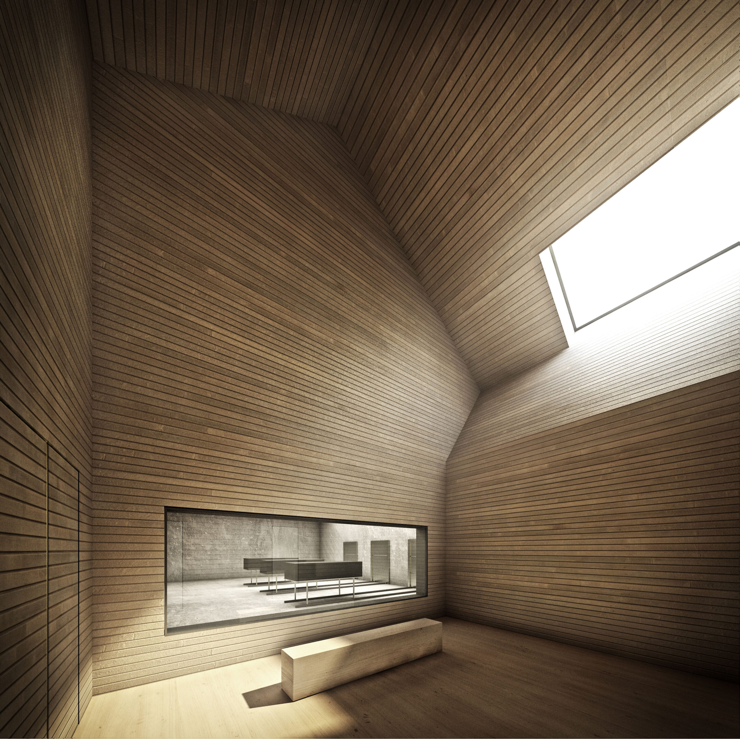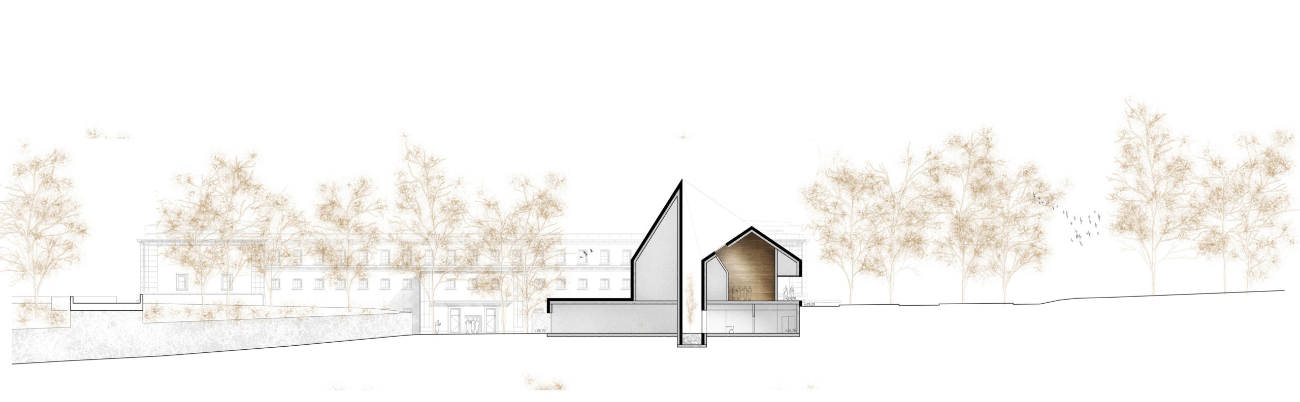 The section of the building creates the chimney and the void that provides natural light to the lower floor spaces. This section and the same section inverted that forms the patio provide the visitors room this particular domestic atmosphere. A space which could not have another use, a “place-home” which receives the visitor to the last goodbye of their loved ones as they were at home. A room to feel the presence of the outside climate change.
