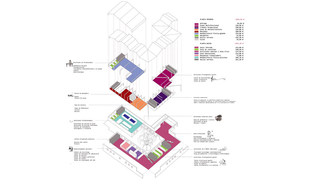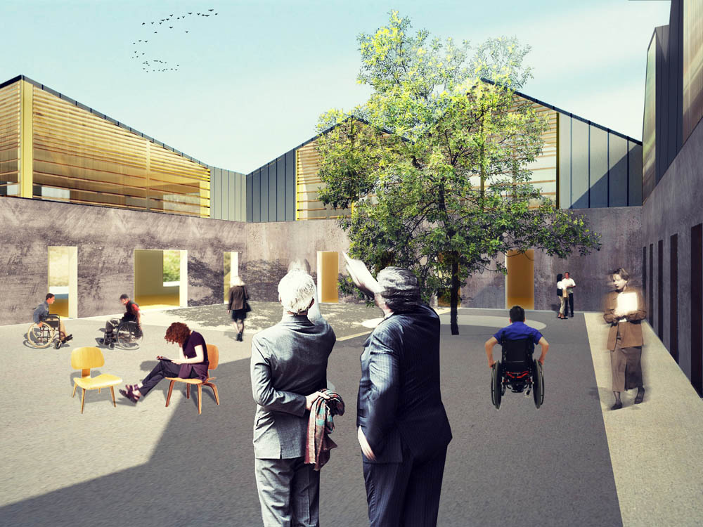 Con la nueva intervención se propone dar una solución a la parte final de la silueta de las adoberías, desde el río. Con la morfología del edificio se crea un patio semipúblico mediante el cual se continúa el recorrido histórico. Este será el espacio exterior de relación de los usuarios donde se realizarán distintas actividades, como jardinería o talleres. Todos los espacios en planta baja tienen acceso a este, provocando así una mayor permeabilidad interior-exterior.