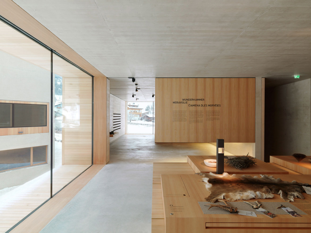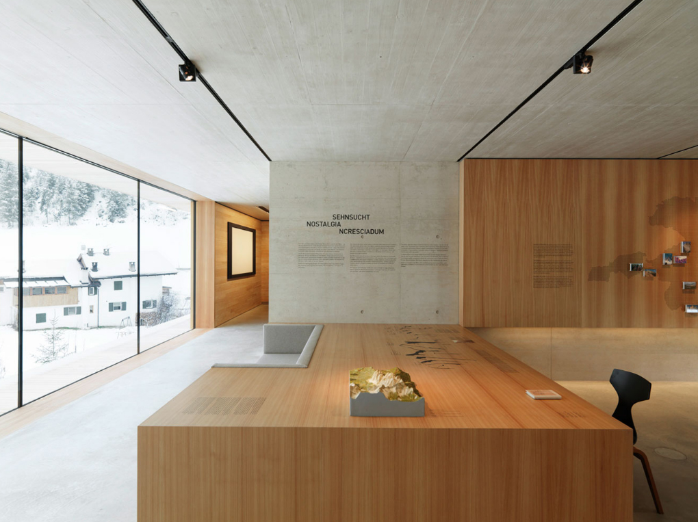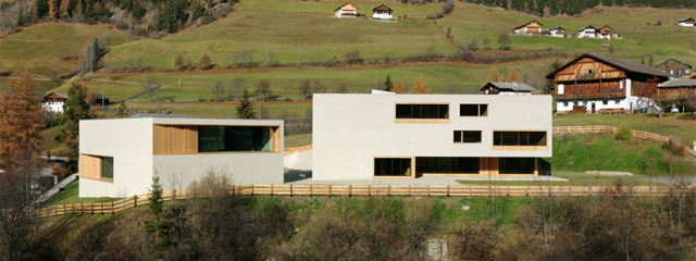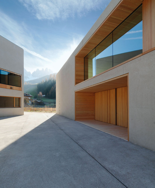 Los volúmenes del conjunto se relacionan a través de un espacio exterior común en el que se producen los accesos a ambas dependencias, a la vez que se dan lugar usos de la escuela primaria situada en los Dolomitas. A través del hormigón visto en fachada y en los espacios interiores, tratado para obtener el mínimo posible de coloración, se pretende obtener una atmosfera rocosa en concordancia con el entorno. La materialidad de estos espacios interiores se completa mediante el uso de la madera que, junto con el hormigón, también está presente en elementos urbanos de los espacios exteriores de la operación.