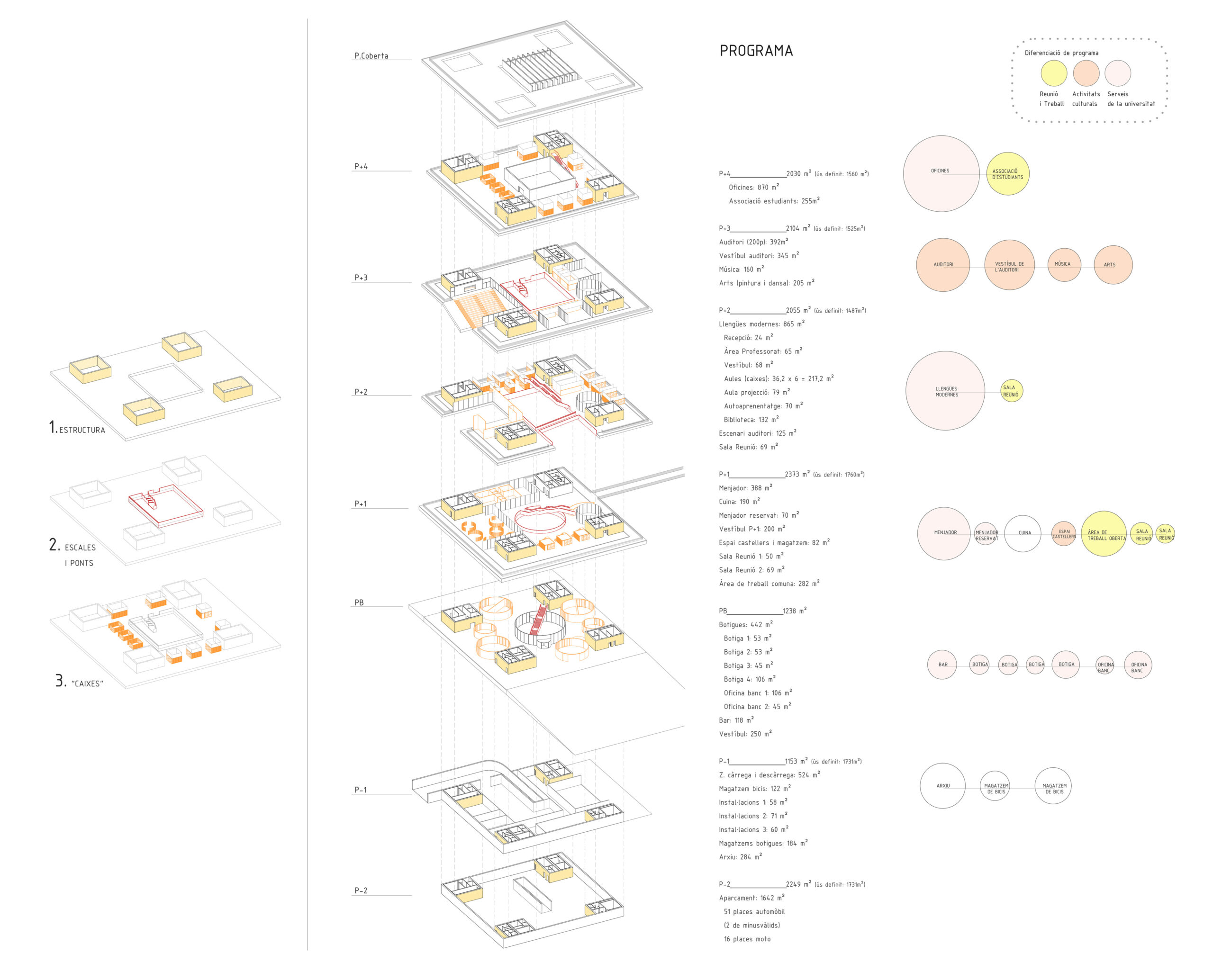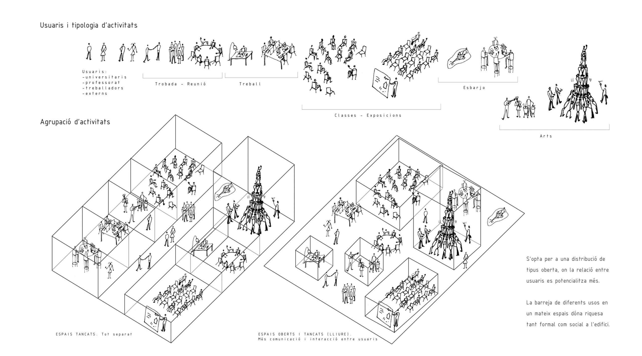 Se propone, pues, un edificio que pueda dar los servicios necesarios a estudiantes, profesores y trabajadores de la universidad. También se proyectan espacios socioculturales: puntos de encuentro y de actividades culturales.