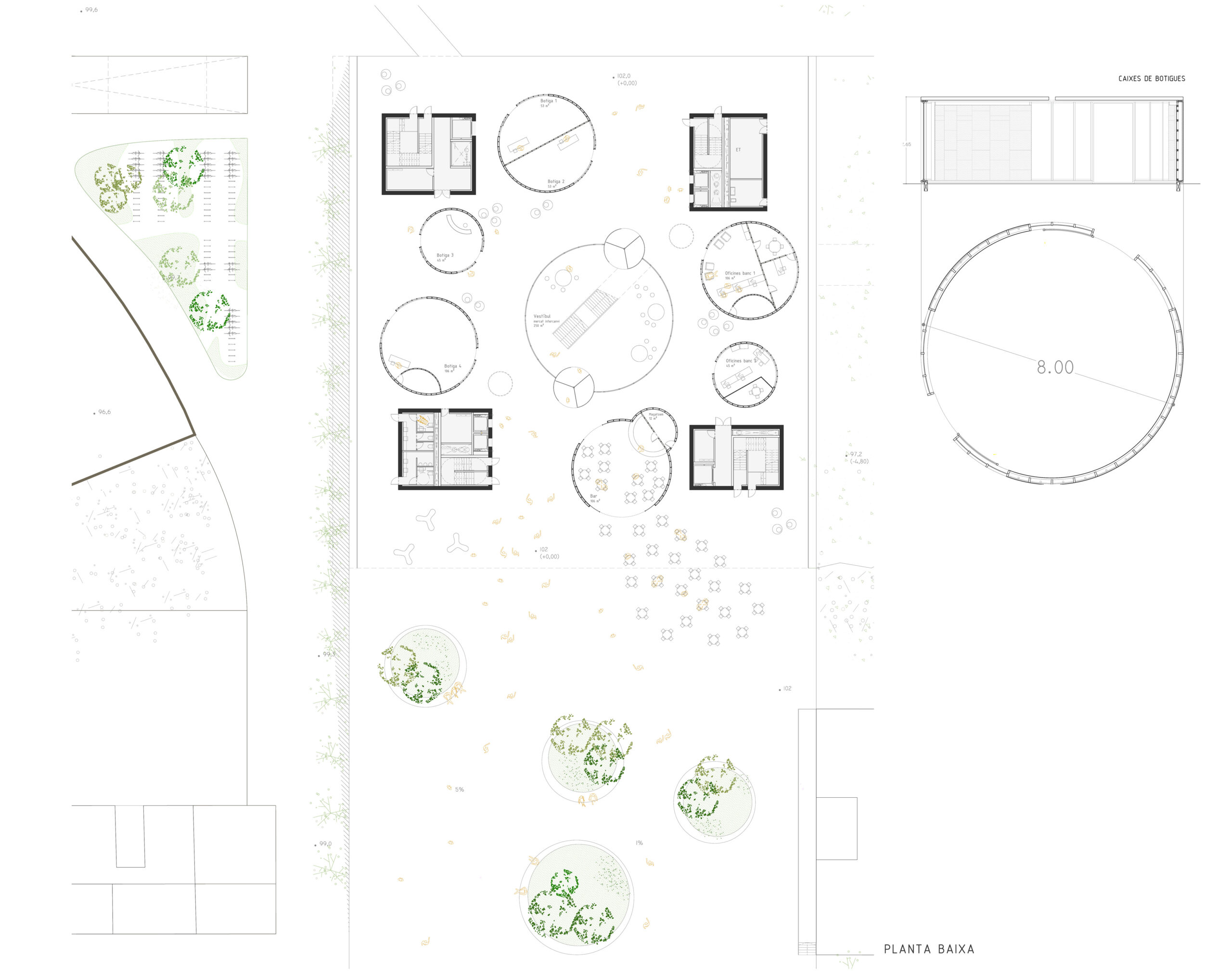 La Planta baja es directamente continuación de la plaza. Es dónde se propone el programa de tiendas, que se proyectan en forma de cilindros de vidrio y madera, dispuestos de forma muy libre. En la plaza se propone la forma circular porqué permite una circulación más libre.