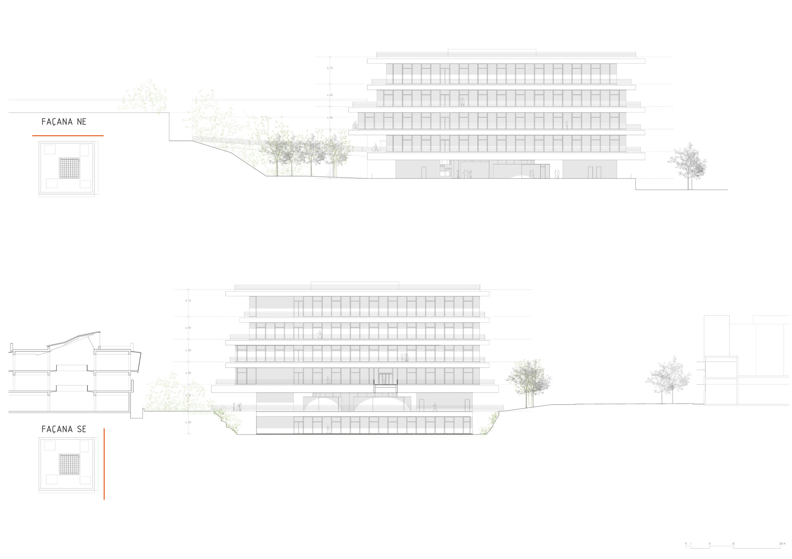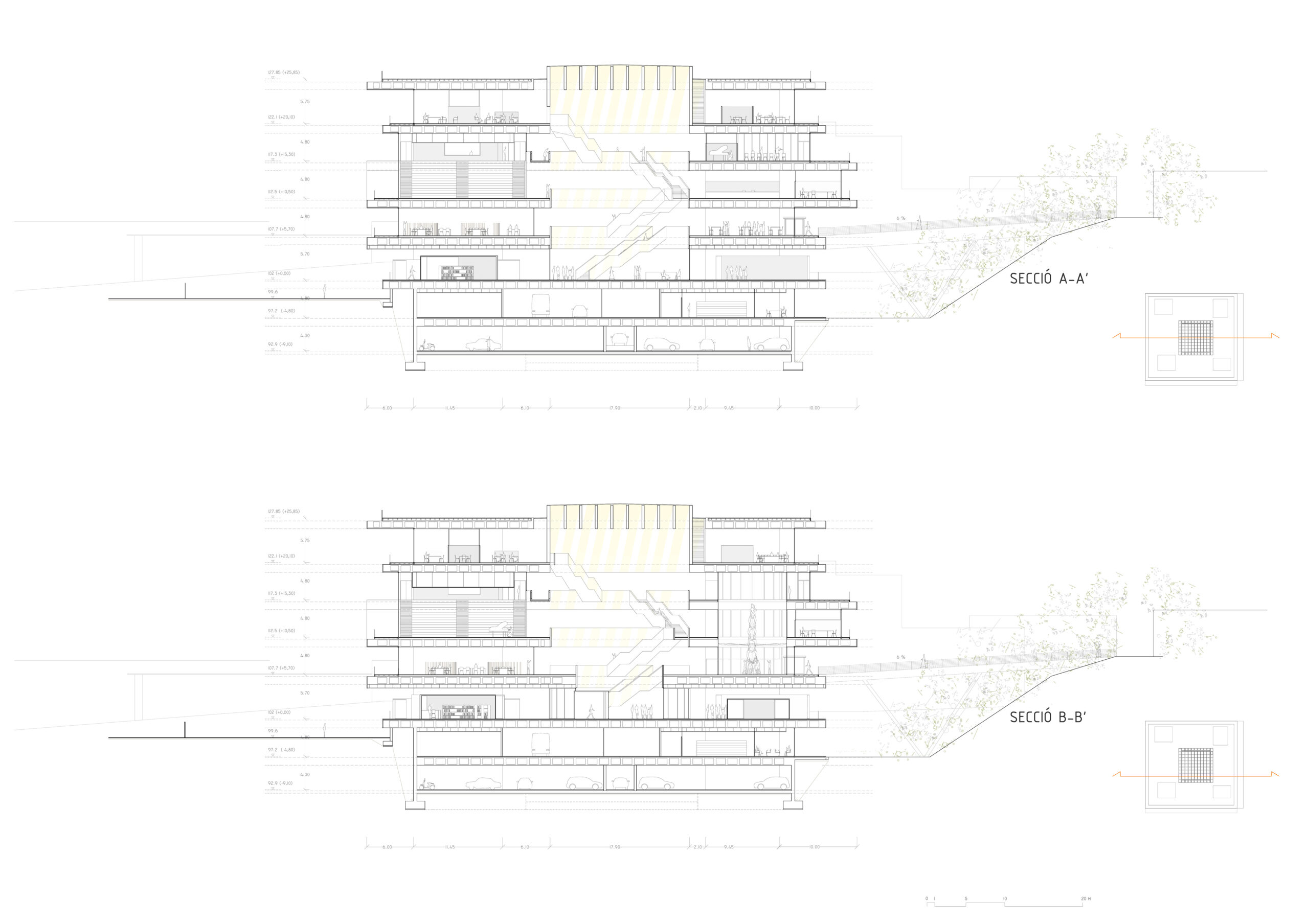 Des de un principio se piensa en un edificio que englobe todos los espacios, todos ellos de naturaleza diferente pero que sean capaces de convivir juntos dando mucha riqueza. Es así que se proyecto un solo edificio contenedor de programa muy diverso.