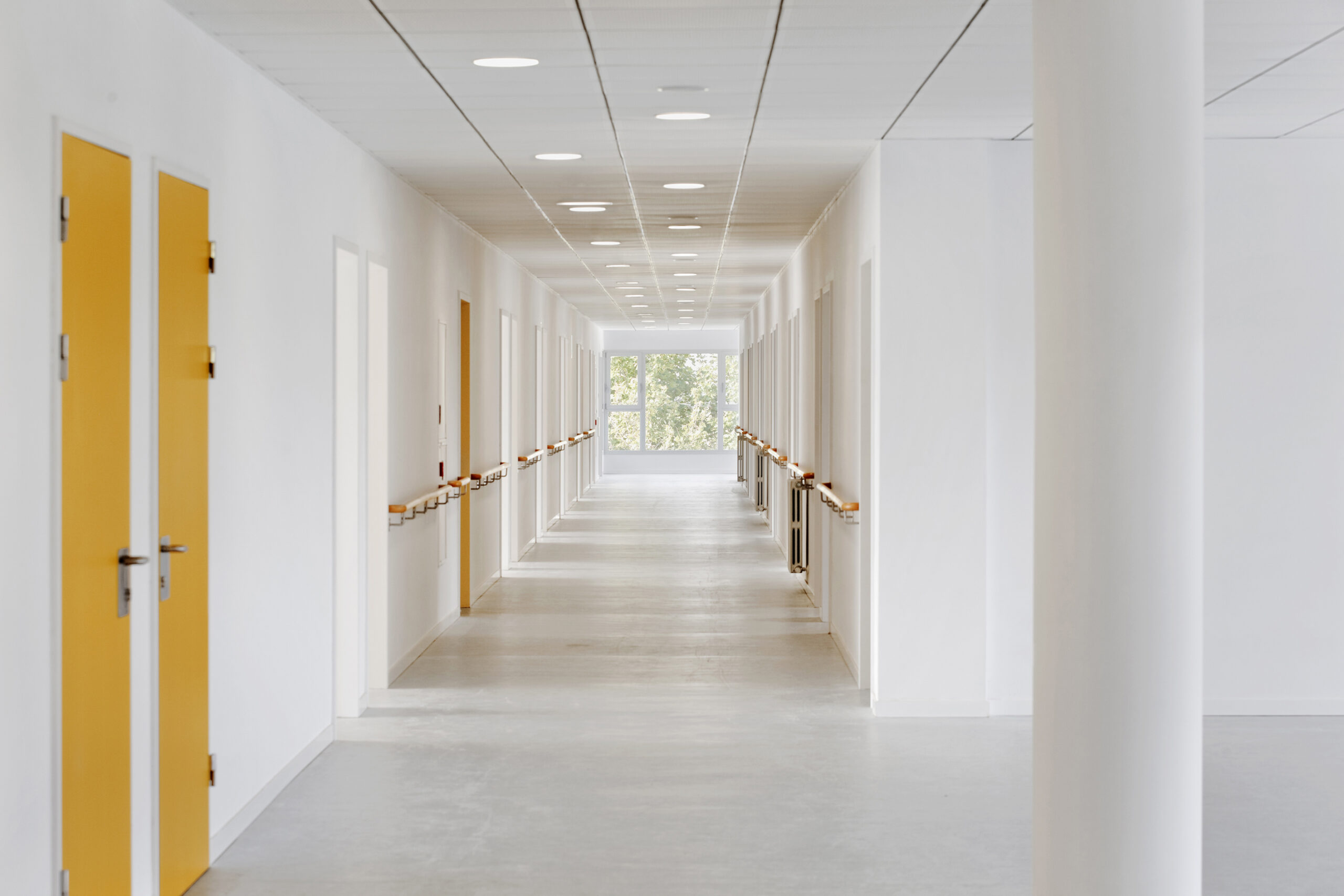 Cada una de las dos alas de las tres plantas de habitaciones, servidas por un corredor central, cuenta con diferentes zonas de estar, atendidas desde el núcleo central de comunicaciones y servicios. En el extremo norte de cada planta una zona de estar se abre hacia el paisaje conformando una tribuna.