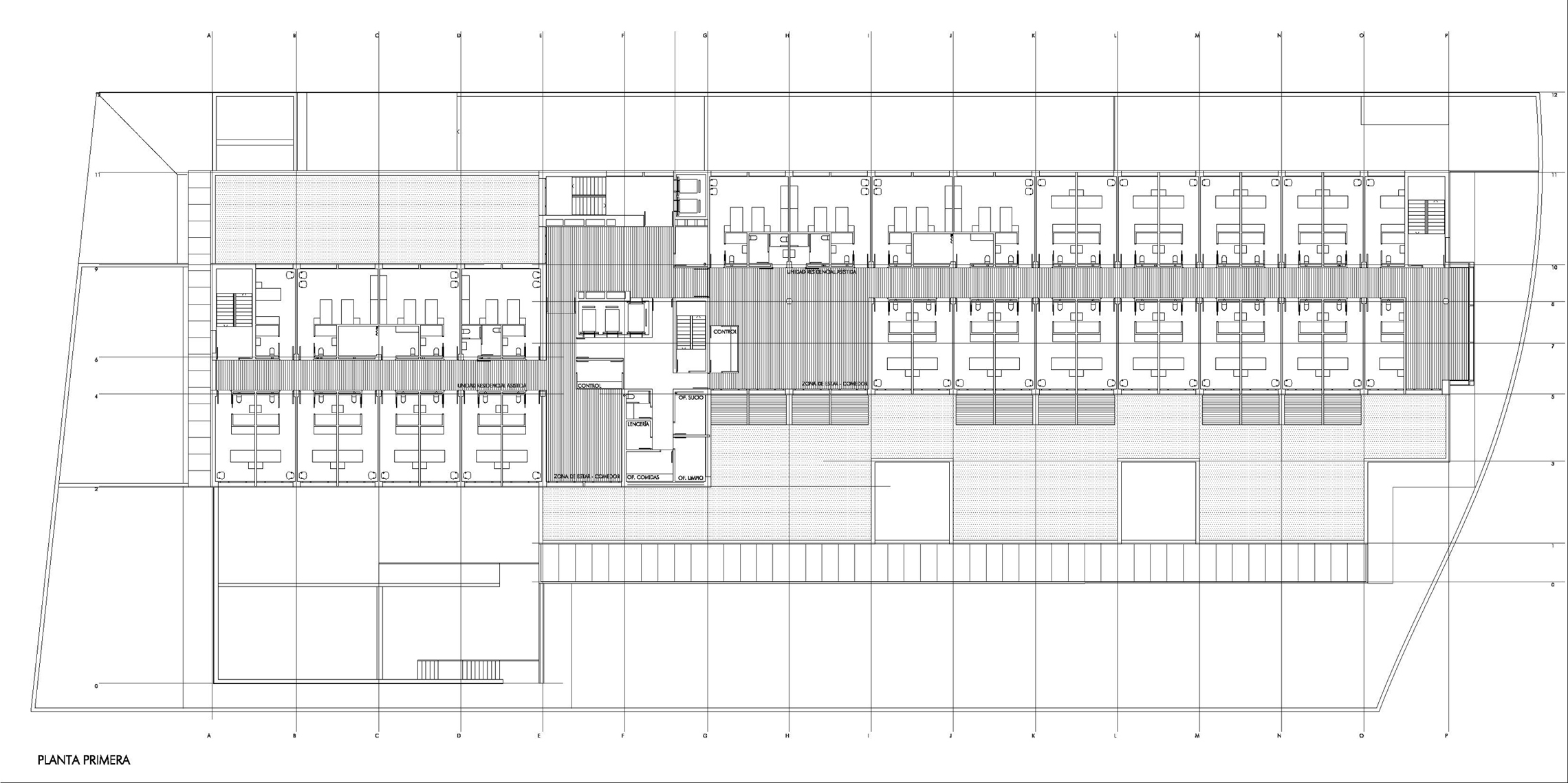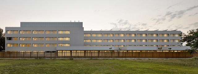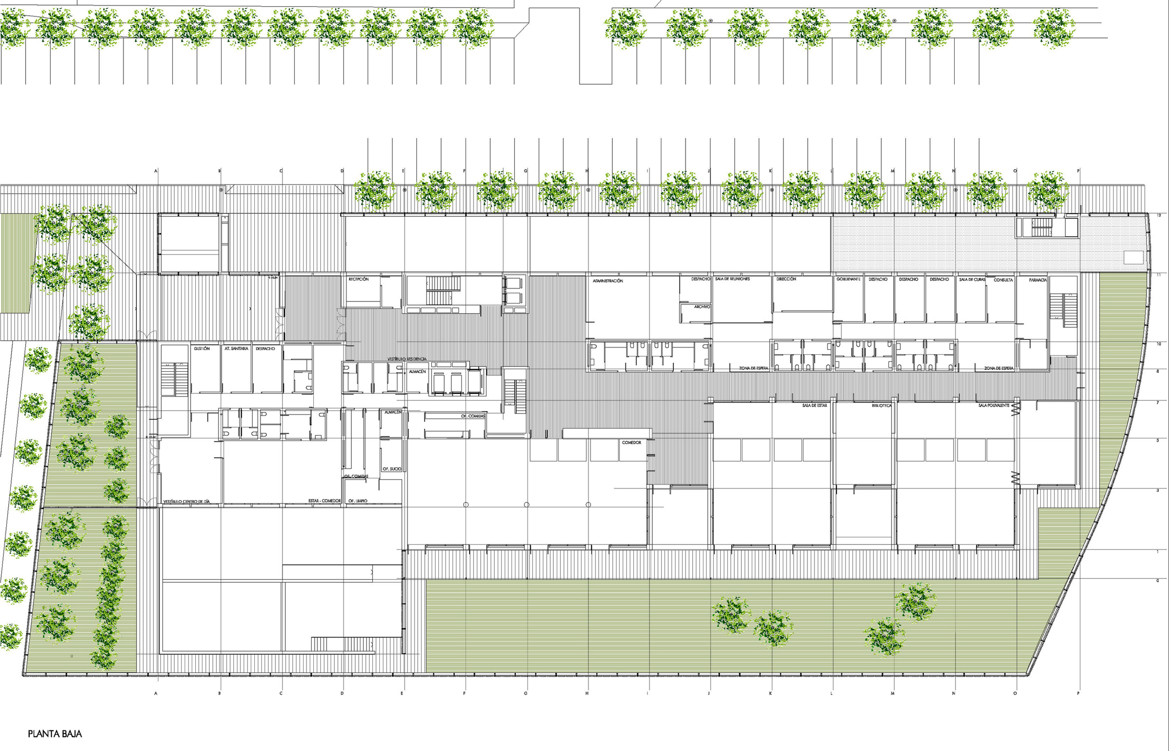 El trazado lineal y decalado de la planta se adapta a su posición en el Parque y al papel del frente del edificio como matizado fondo del mismo, respondiendo a las características diversas de los espacios circundantes y a las diferentes necesidades de los accesos. Por otro lado la traza y el carácter permeable de la planta baja permiten graduar y establecer un contacto más estrecho con el terreno, mientras que la celosía de madera del cerramiento difumina la separación de los espacios exteriores privativos del edificio con el resto del Parque.