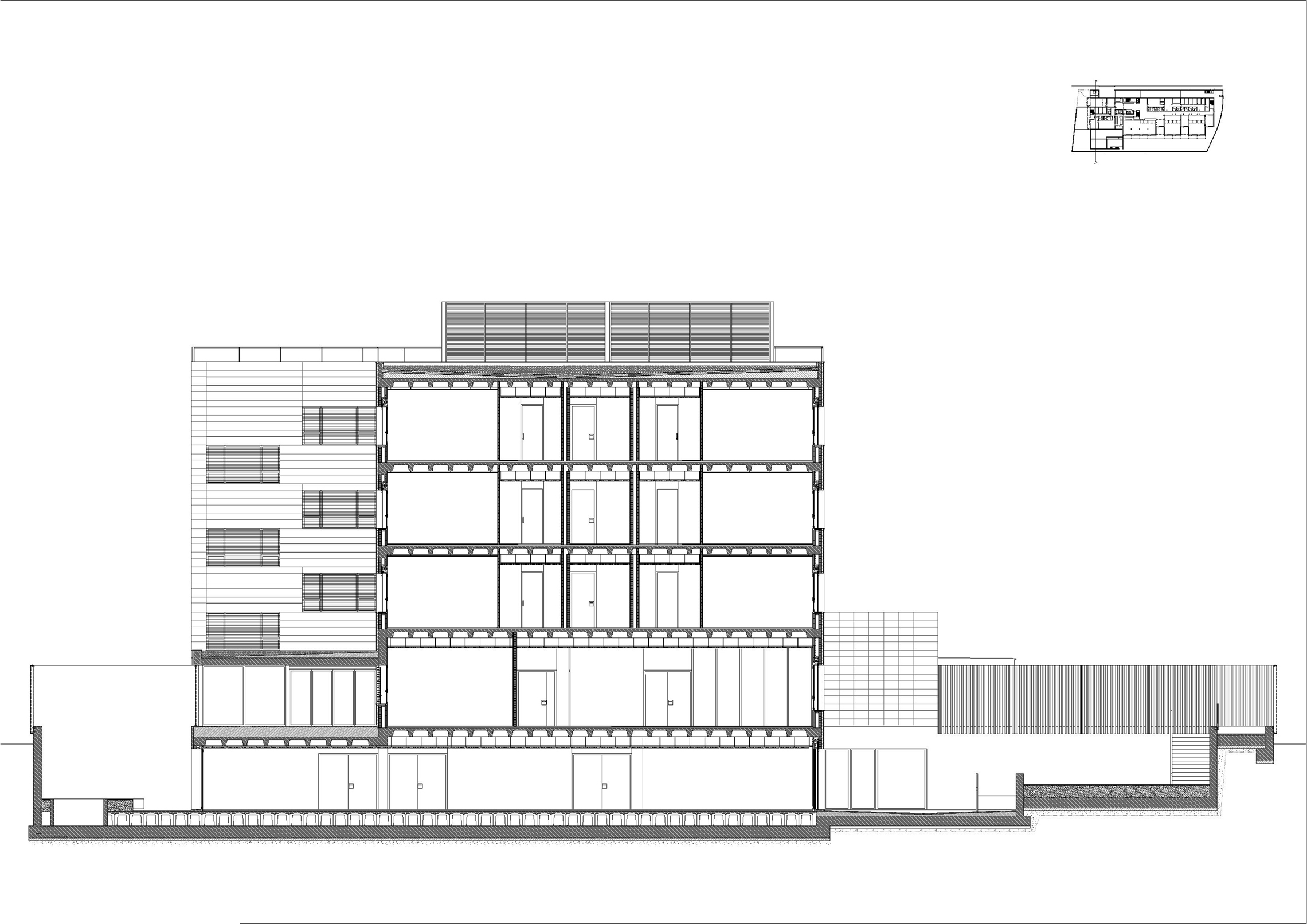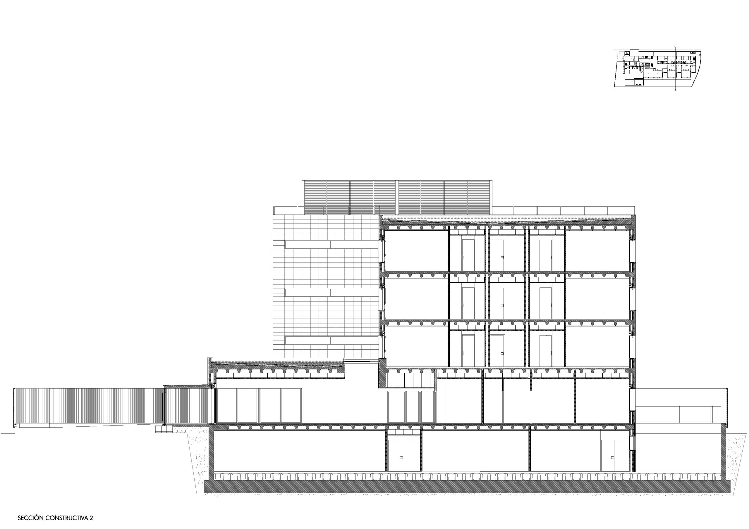 El edificio adopta una disposición longitudinal, en consonancia con las proporciones de la parcela situada en uno de los extremos del Parque de Las Fuentes, con un retranqueo en planta coincidente con los núcleos principales de comunicaciones y de servicios. En las plantas superiores este retranqueo permite una clara diferenciación entre las cuatro unidades que constituyen los espacios de uso privado. En planta baja, el retranqueo determina la posición del acceso principal a la Residencia desde el sur, diferenciándolo del acceso al Centro de Día que se produce desde el oeste, a través de un patio privativo.