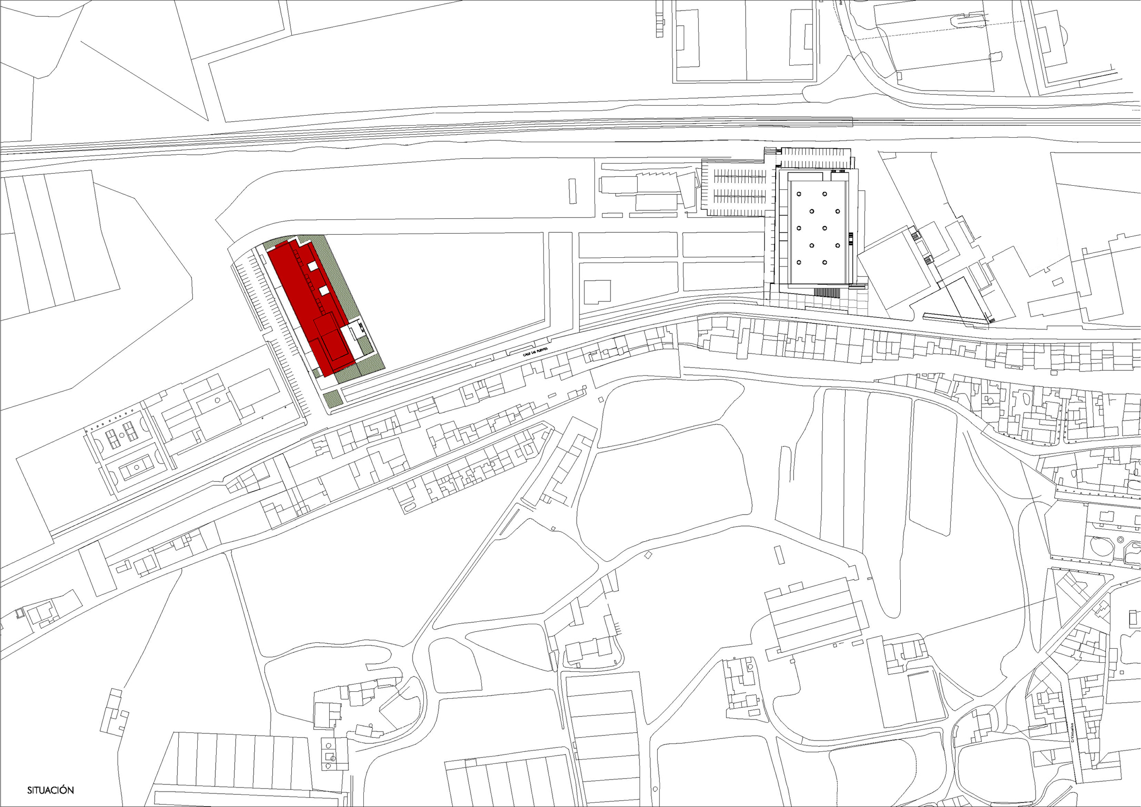 El apoyo en la calle que limita el Parque por el oeste, hace que se concentren los accesos en el ángulo suroeste de la parcela, disponiendo la rampa de acceso al aparcamiento y el patio inglés que la prolonga, en paralelo a la fachada oeste. Por el este, la Residencia se enfrenta al espacio libre que limita con el Parque, lo que permite que las salas principales avancen y se orienten decididamente hacia dicho espacio verde longitudinal, que engloba parte del arbolado existente, subdividido en recintos exteriores, interconectados pero diferenciados, destinados a los usuarios del Centro de Día, al personal del centro y a los usuarios de la Residencia. Un porche discurre en paralelo a la fachada oriental, adoptándose un sistema de cerramiento de la parcela compuesto por montantes de madera laminada que permitan una adecuada integración del mismo.