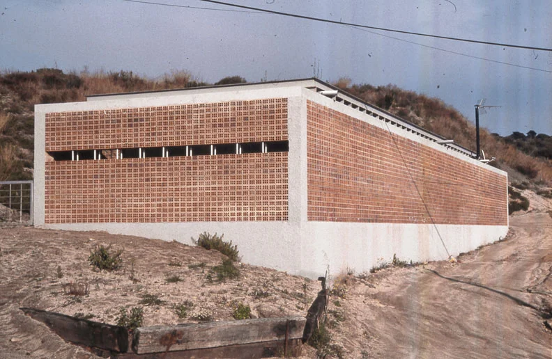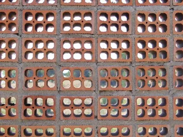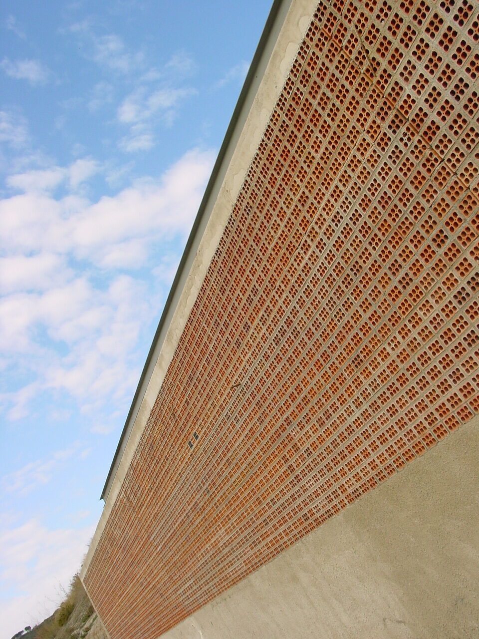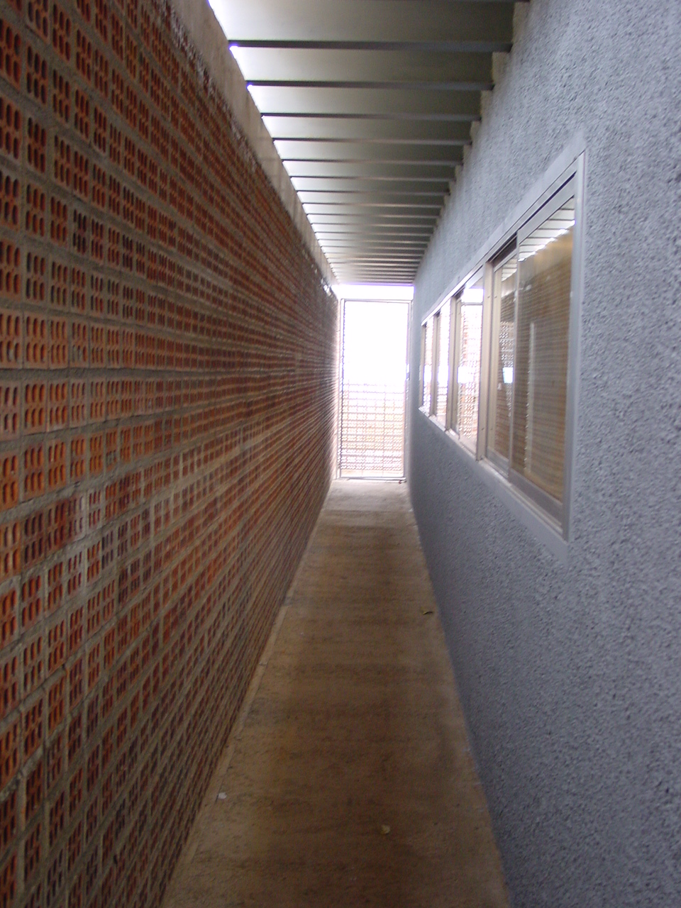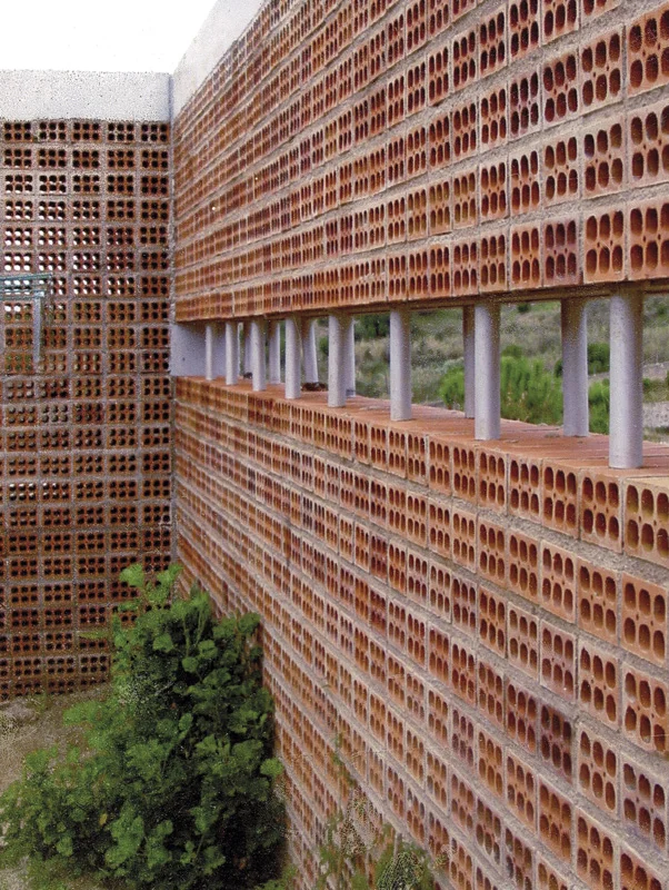 El hecho de pensar en una construcción con mucha privacidad, sin necesidad de vistas y, además, con un presupuesto muy reducido y un plazo de ejecución muy rápido, llevó a utilizar el ladrillo más económico que se utiliza en la construcción convencional. Este tipo de ladrillo llamado “tochana” tiene seis agujeros, y una dimensión de 10x15x30, con los agujeros dispuestos en sentido longitudinal, ocupan una superficie aproximada del 50% destinada a la iluminación. La “tochana” si se analiza con detenimiento se observa que a diez o quince metros de distancia, los huecos permiten una notable transparencia. A una distancia de dos o tres metros, esta transparencia se pierde, quedando únicamente un círculo de uno o dos metros de diámetro, con algo de transparencia, si nos colocamos a diez centímetros de una “tochana” de seis agujeros, únicamente vemos cuatro debido al prisma visual, que no permite ver los agujeros que tenemos enfrente de la nariz.