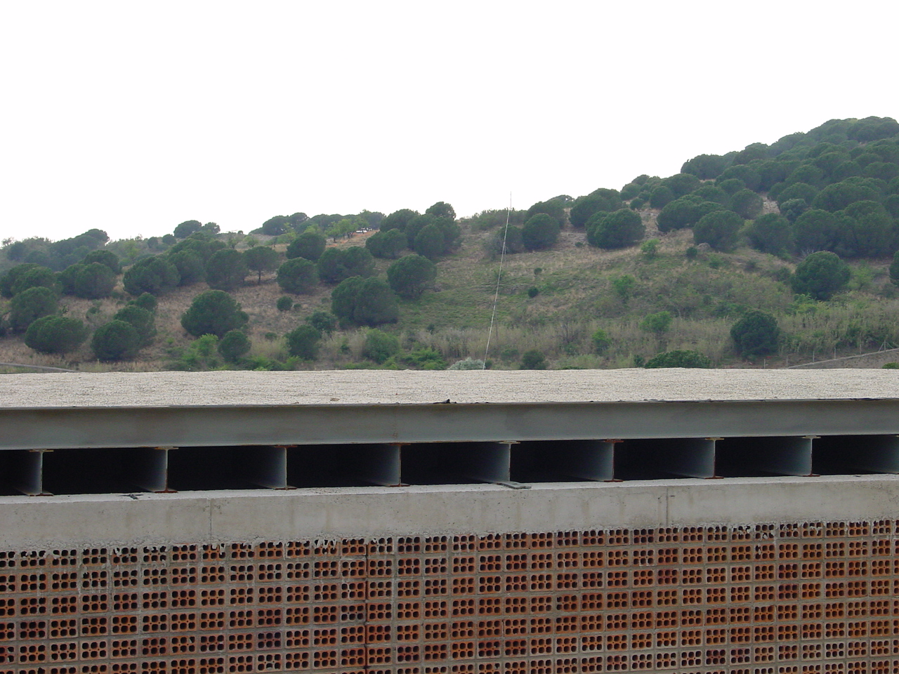 La cubierta esencialmente es una piscina de tierra “saulo” de unos 16 – 20cm. de profundidad, prácticamente sin desagües y que permite crecer algunas hierbas, como ocurre en otras partes de la finca. El forjado de la piscina esta formado con piezas machiembradas entre vigas con doblado de otra capa de rasilla cerámica y con una tela asfáltica que sube unos 20cm. por cada lado formando la pequeña piscina de tierra.