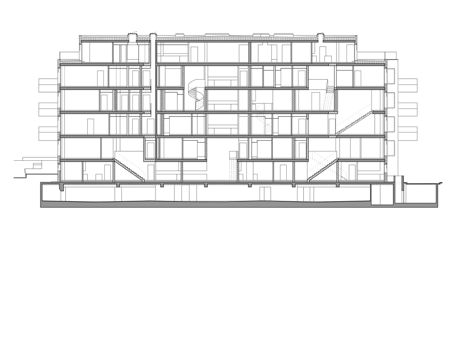 The conversion of this blocky office building dating from the 1970s makes what was formerly a self-centred foreign body into an integral part of the district. Our aim, however, was not to domesticate the existing building but rather to profit from its bulky quality. The considerable room heights of the existing building relieved the problem of providing sufficient light posed by building depths of up to 24 meters while also helping to give the rooms a sense of spaciousness. The building was stripped back to the load-bearing structure and a second staircase was added to the circulation system.