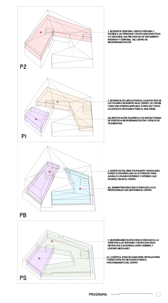 El proyecto parte de un concurso para un Centro de Neurorehabilitación en Tarragona, fruto de la demanda existente de un edificio especializado para personas con dependencia física. Un edificio donde acude gente que ha padecido algún tipo de trauma en su vida (accidente o enfermedad); un equipamiento habitado, que pretende acoger a los usuarios y ayudarles en su recuperación y realización personal, desvinculadose de la idea de edificio hospitalario.