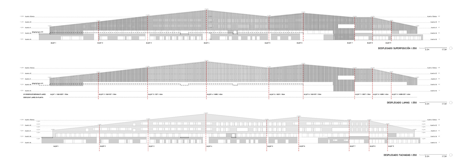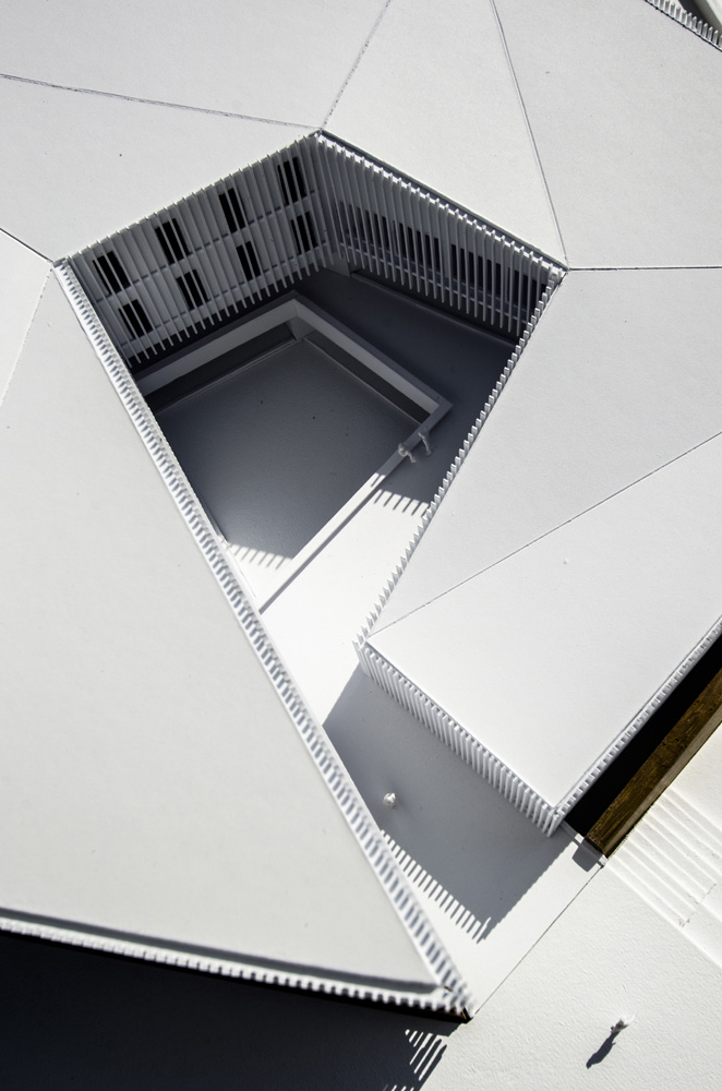 De esta forma el edificio se amolda al perímetro exterior del baluarte, dominando el paisaje sin un impacto agresivo, apelando a una forma previa existente. Los accesos públicos se sitúan en el patio, arropando al usuario. La cubierta se pliega para permitir las vistas en las buenas orientaciones y el asoleo del patio; al mismo tiempo que configura un volumen único abstracto separado del baluarte, respetándolo y dotándolo de uso.