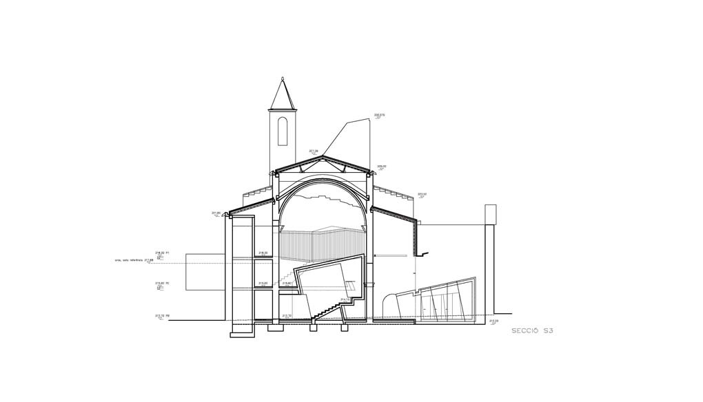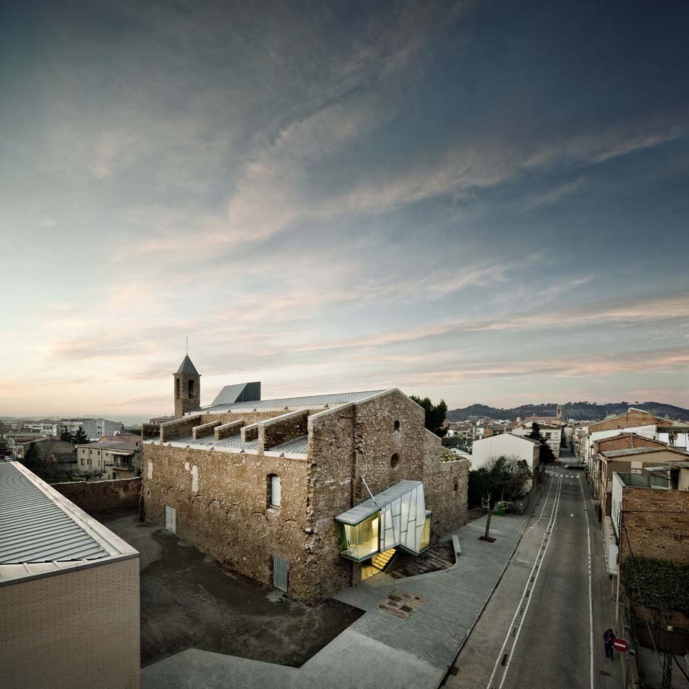 El planteo principal del proyecto de intervención ha sido no alterar las dimensiones y la cualidad espacial de la nave de la iglesia y mantener las importantes entradas de luz natural producidas por los hundimientos. El mantenimiento de las entradas de luz en los distintos puntos –y en la cantidad importante con que se producía- ha comportado plantear diferentes soluciones de cubierta específicas en cada uno de los sitios: una gran claraboya en el lado norte del absis, un tragaluz que permite mantener las vistas del campanario des del interior de la nave, la ausencia de cubierta en la capilla principal y un corte en la cubierta justo al inicio de la nave que garantiza mantener una entrada de luz rasante sobre la parte interior del muro de acceso.