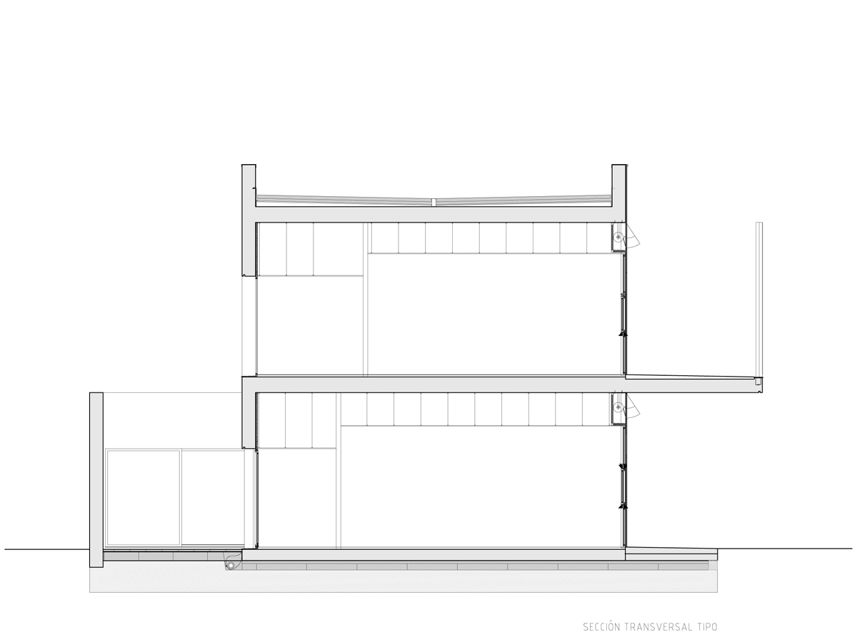 La escasa superficie de terreno disponible impedía desarrollar el programa en una sola planta, como hubiera sido deseable, por lo que se optó por organizarlo en dos plantas, lo cual permitió orientar hacia el sur todas las aulas. La obvia necesidad de patios de recreo y sus correspondientes porches en ambos niveles se solventó con un decalaje estructural de la sección. El acceso a las aulas, en ambos niveles, se organizó mediante un ancho pasillo iluminado a través de un patio adosado a la medianera del vecino. La entrada, situada en uno de los extremos del volumen, se protegió mediante otro desplazamiento del volumen superior que generó un gran vuelo sobre el acceso.