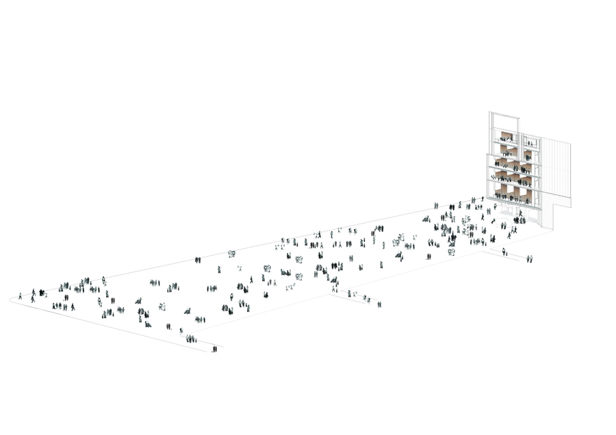 Los espacios de foyer, espera y circulación de los diferentes niveles estarán colocados a lo largo de las fachadas longitudinales, en el frente mirando a la plaza. Movimiento, espera de los usuarios y transformaciones del espacio interior son la fachada real de la pieza urbana. Con esta operación, y añadiendo la transparencia de la fachada de vidrio, aumentamos la visibilidad de la institución, estableciendo un dialogo con la plaza y la ciudad. Además estos espacios de foyer  actuaran como cojín climático y acústico, resguardando el programa de formación y difusión.