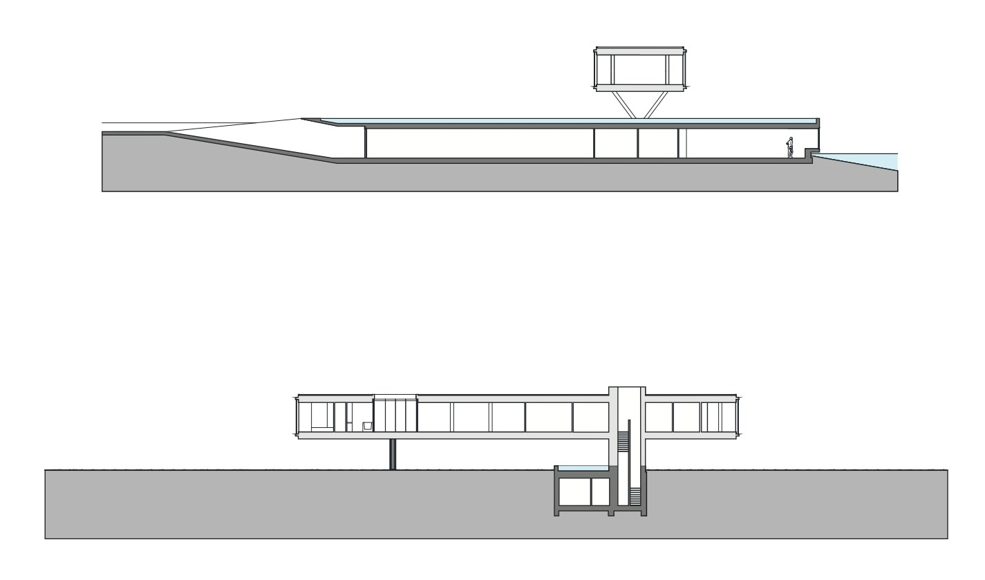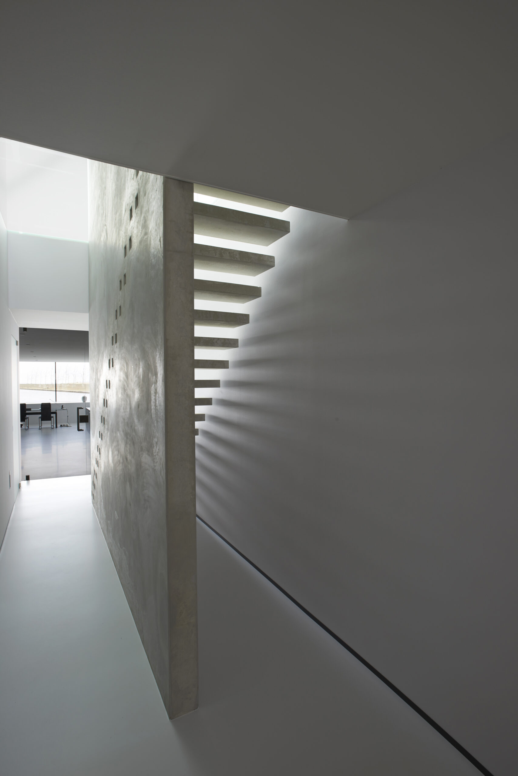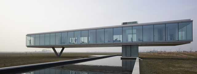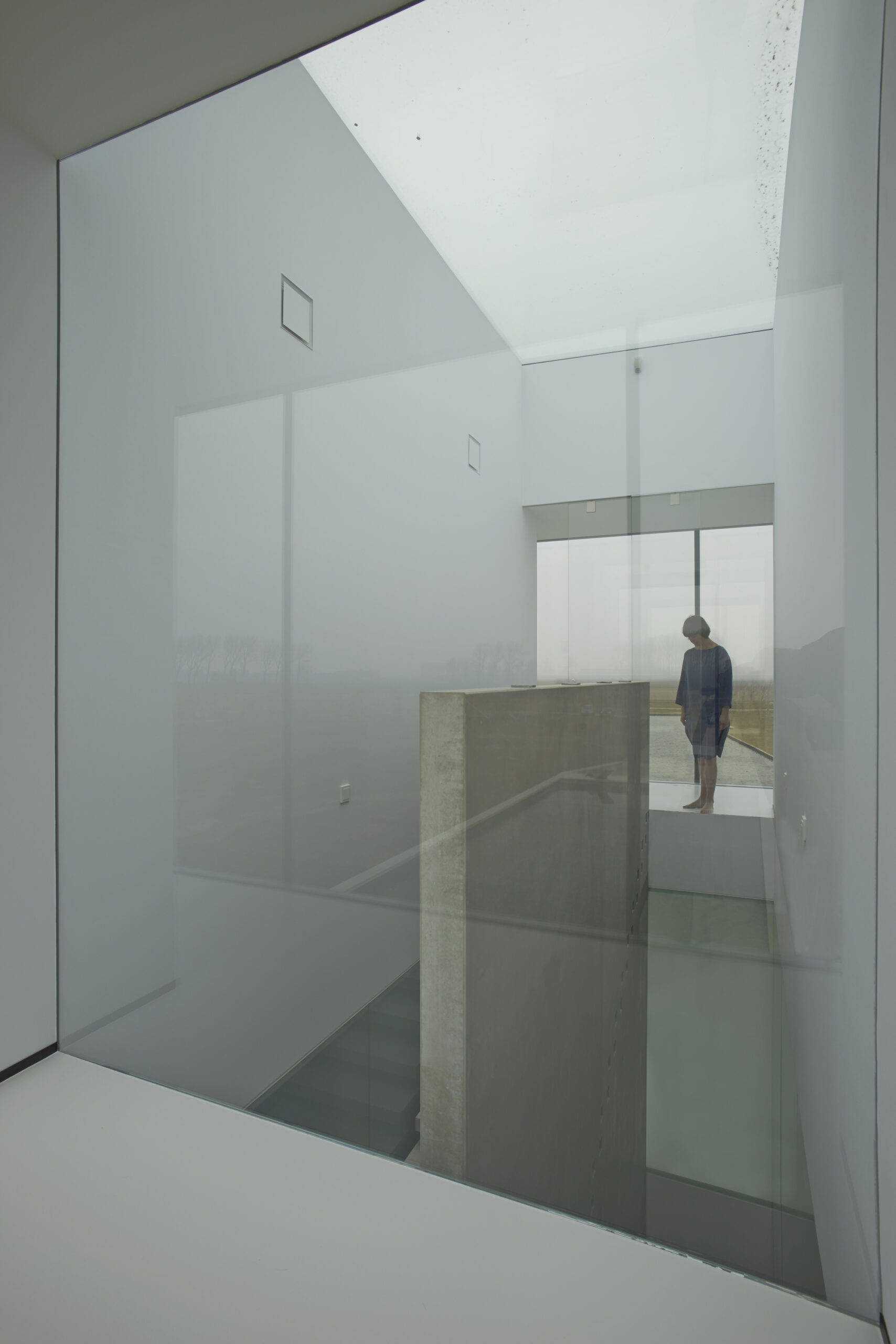 The underground volume of the house consists the entrance, parking (for 6 cars and a tractor), storage, bathroom and a workspace which looks out over the pond. The living area is situated in the floating glass box above ground. It’s floor plan is completely open, except for some subtle glass room dividers. There are several separate volumes for the kitchen, bedrooms, bathroom and a multifunctional room. The patio has glass doors on both sides, so that it’s both accessible through the living room and the bathroom. The entire floor is covered with white epoxy and the furniture consists of designer classics from Le Corbusier and Eileen Grey. The façade is completely made out of glass and offers a spectacular view over the surrounding landscape.