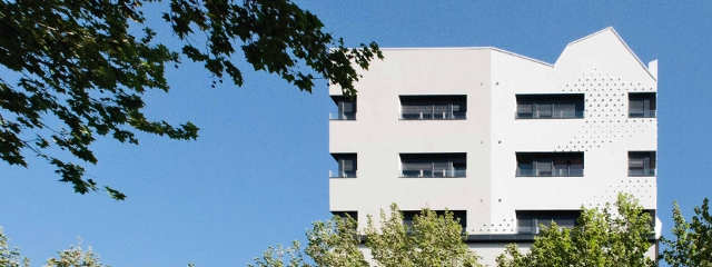 …El edificio convive perfectamente con todo esto como un organismo que, más que estar recién acabado, lleve cincuenta años allí. Es difícil de fotografiar. Si bien es capaz de conseguir que sus viviendas respiren a la perfección, su volumetría, los árboles crecidos y las piezas de su entorno apenas dejan perspectiva suficiente para la media distancia necesaria para tomar vistas.