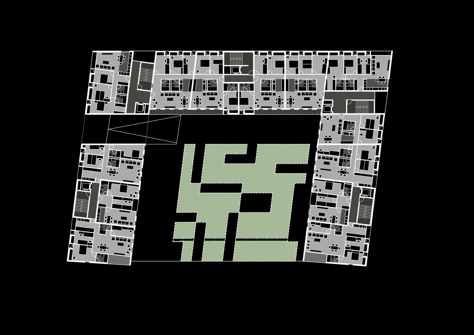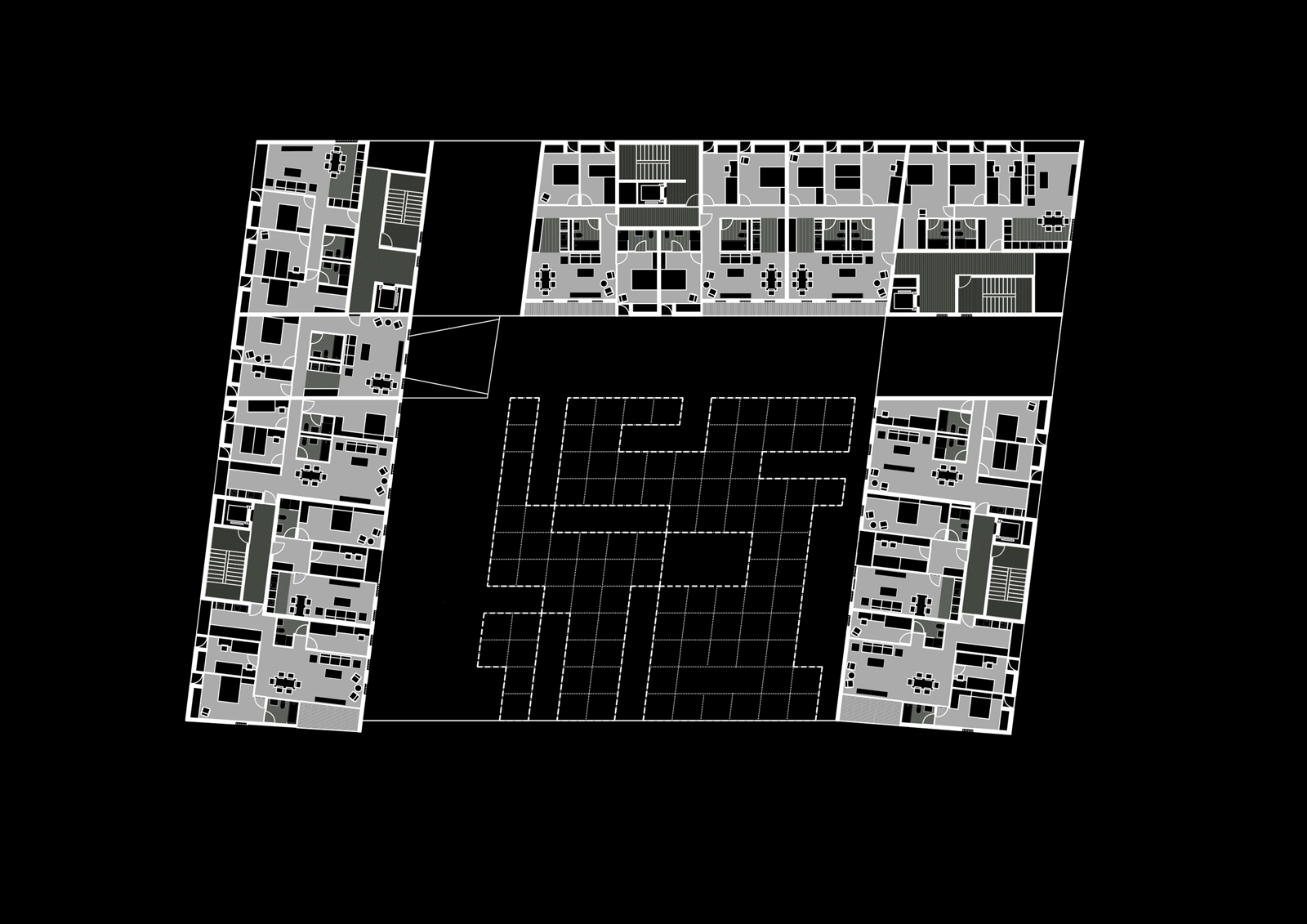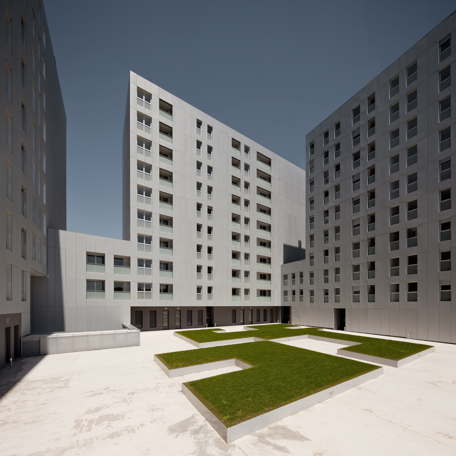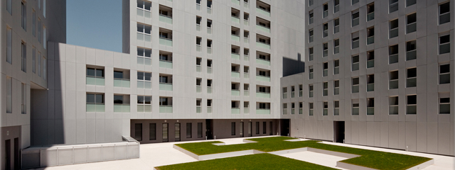 Se adopta la forma de U prevista en la ordenación inicial, efectuandose 3 vaciados en las esquinas que al descomponer el volumen inicial, permiten un mayor asoleo y desahogo del patio. La fachada doméstica se envuelve con paneles de aluminio reciclado perforado que proporciona imágenes cambiantes simulando un gran mural de luces y sombras, que varían en función de las aperturas y la iluminación de los huecos. Esta piel puede abrirse ó cerrarse en todos los huecos de fachada, a modo de contraventana practicable. El efecto final aporta una imagen unitaria a la manzana y la dota de un carácter propio frente a su entorno.