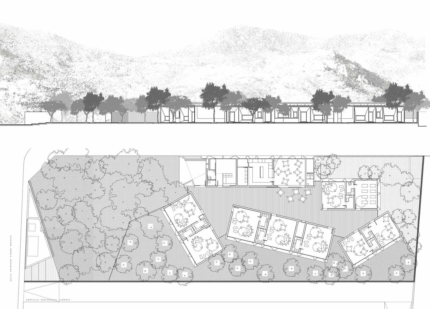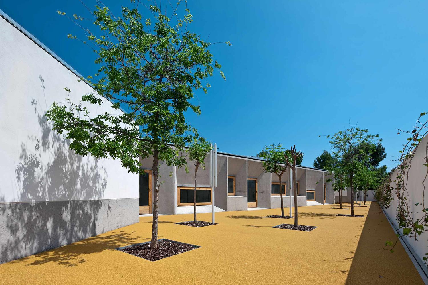 Todas las unidades son iguales y al mismo tiempo son diferentes por su posición respecto al sol, las vistas y la relación con sus vecinos. Entre todas forman una comunidad que se reúne en torno a un espacio central, un lugar común a modo de patio cubierto donde compartir experiencias, una casa patio. La comunidad pertenece a un grupo mayor integrado en la ciudad, por lo que el espacio central tiene continuidad en una arboleda donde las unidades encuentran cobijo, una casa patio dentro del bosque. La arboleda crece y se funde con el espacio urbano formando un jardín de acceso público que mira al Desierto de las Palmas, paisaje fundamental de la identidad común de Benicàssim, Can Feliç una casa patio dentro del bosque en el paisaje de Benicàssim.
