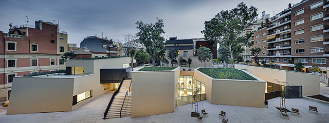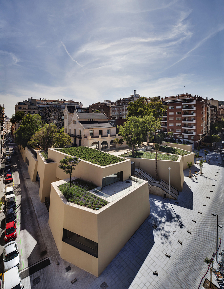 El jardín existente se extiende a través de la cubierta de la nueva biblioteca, hasta la misma calle de Sant Gervasi de Cassoles, desde donde se plantea un nuevo acceso a los jardines junto al acceso al vestíbulo principal de la Biblioteca. Los árboles originales del antiguo jardín han sido replantados en la cubierta de la nueva biblioteca.