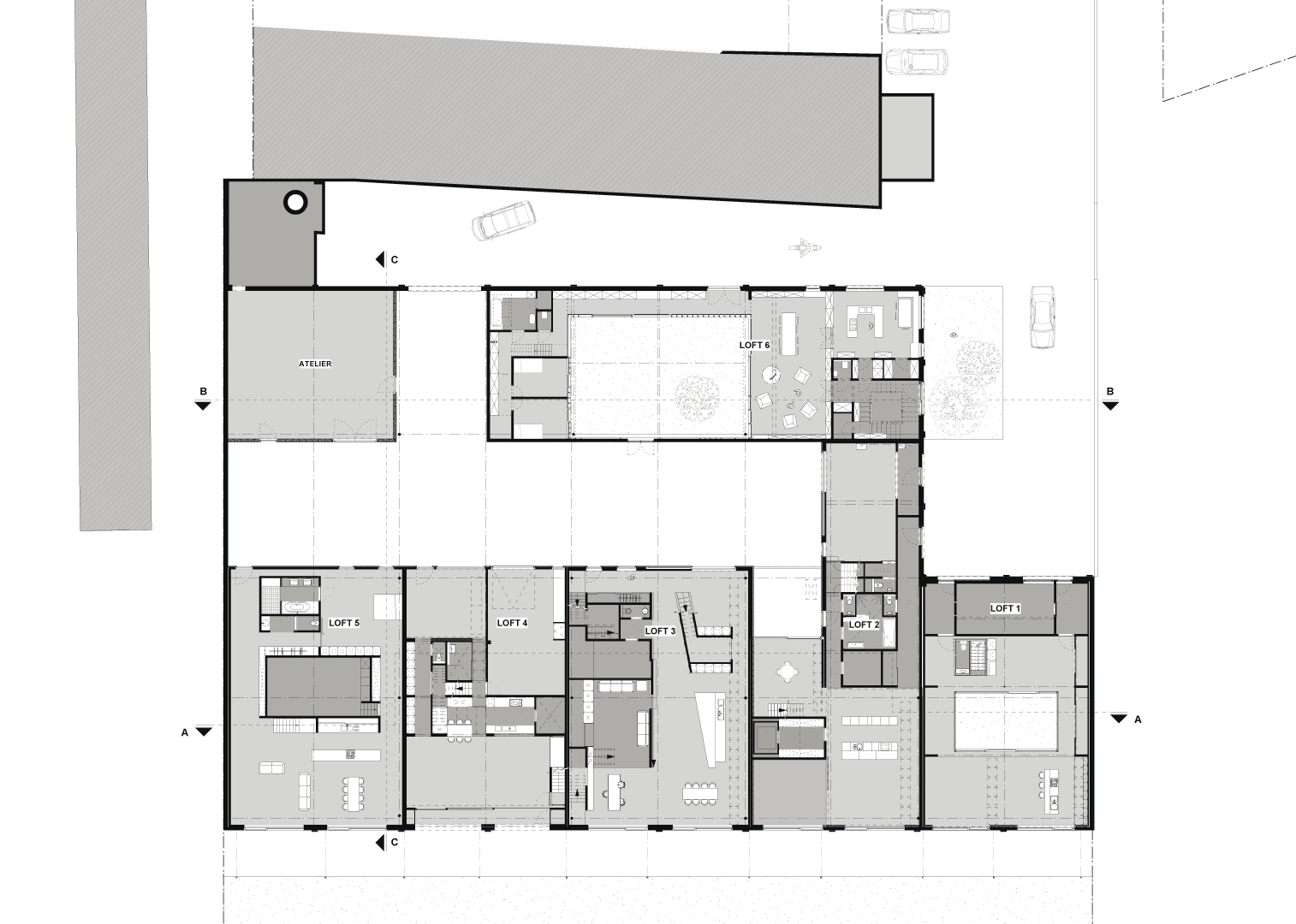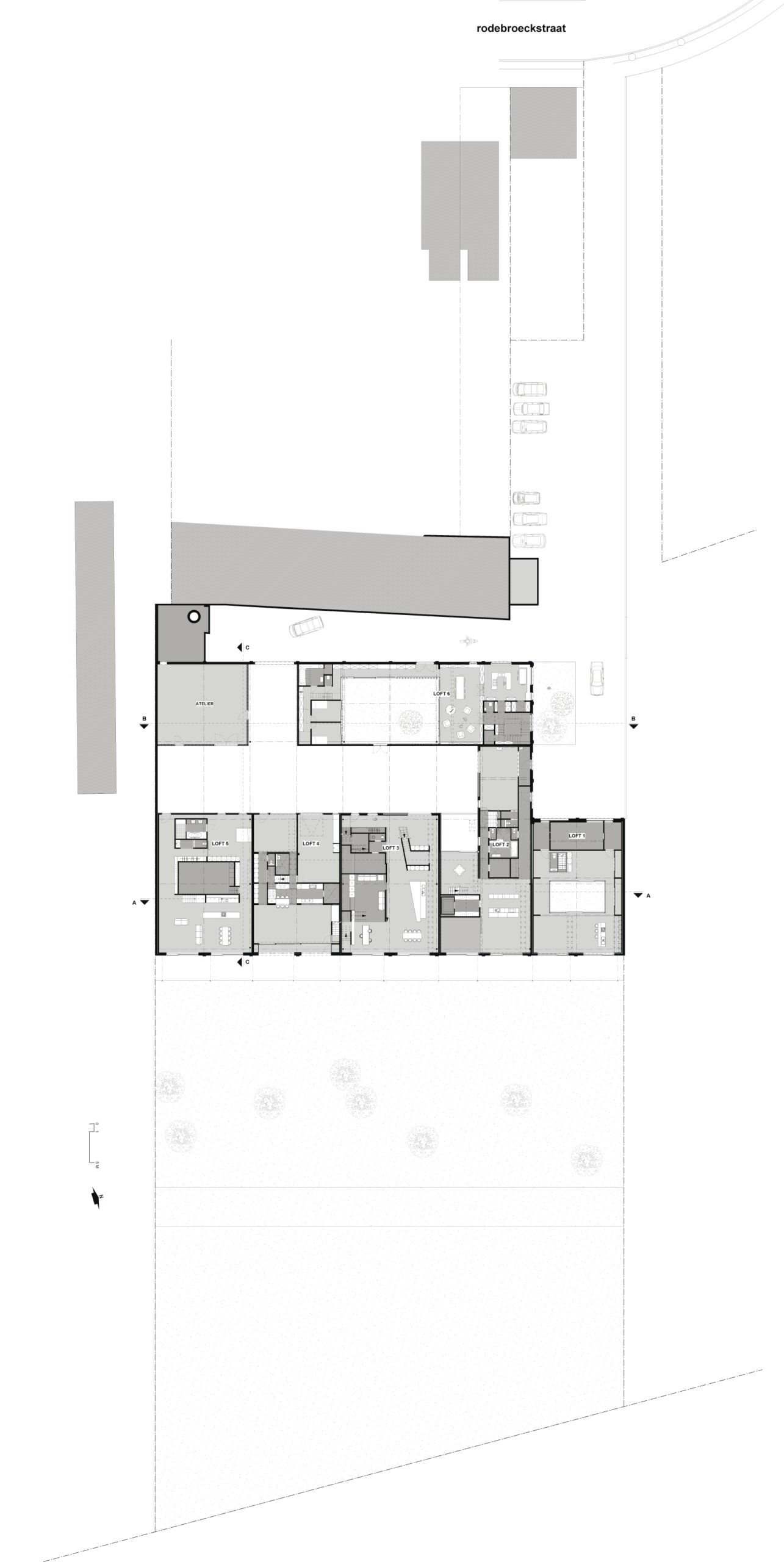 El resultado final es una mezcla de 6 apartamentos, 1 estudio y 2 oficinas. El espacio exterior común actúa como un elemento de enlace y como un sistema circulatorio hacia y entre los diversos componentes. Detrás de un sistema uniforme, fachada orquestada como una de las principales variedades de viviendas ocultas: la variación en la escala, la variación de las generaciones y los programas, la variación en el concepto espacial y la variación en la participación en las zonas exteriores comunes.