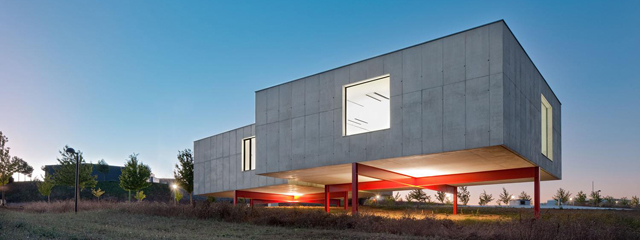 Sobre la anatomía cuadrúpeda, que evita la ocupación de la naturaleza, se apoyan sendas cajas de hormigón. Para que ello suceda, la caja se piensa como una segunda estructura, que cambia paredes por vigas y techos por dobles losas. Las caras verticales de la caja son vigas cuyo canto coincide con su altura. En cada uno de sus vanos se abre un único hueco, definido por las dimensiones máximas que permite el esfuerzo de la viga. Su cara horizontal, se convierte en una doble losa armada. El haz y envés de estas cajas, suman una nueva gravedad. Al exterior, el hormigón que lo construye como estructura es visible en todas sus caras. En su interior, se reviste de placas de cartón yeso. Su blancura dota al intradós del muro de una materialidad proporcional a la anatomía cuadrúpeda que la soporta. Una materialidad que quiere hacer pensar al que la mira, que surge de una sencilla manipulación. Casi hecha con las manos. La carpintería, dibujada en un solo trazo, se oculta entre ambas hojas. Su desaparición colabora a la lectura simultánea de aquel haz y envés. La suficiente separación de ambas hojas en el muro y la doble losa en el plano horizontal, permiten tejer en su interior una densa red de fontanería, electricidad, voz y datos. Esta red vertical y horizontal, resuelve una necesaria flexibilidad para la continua transformación que necesita el laboratorio como forma de trabajo e investigación.