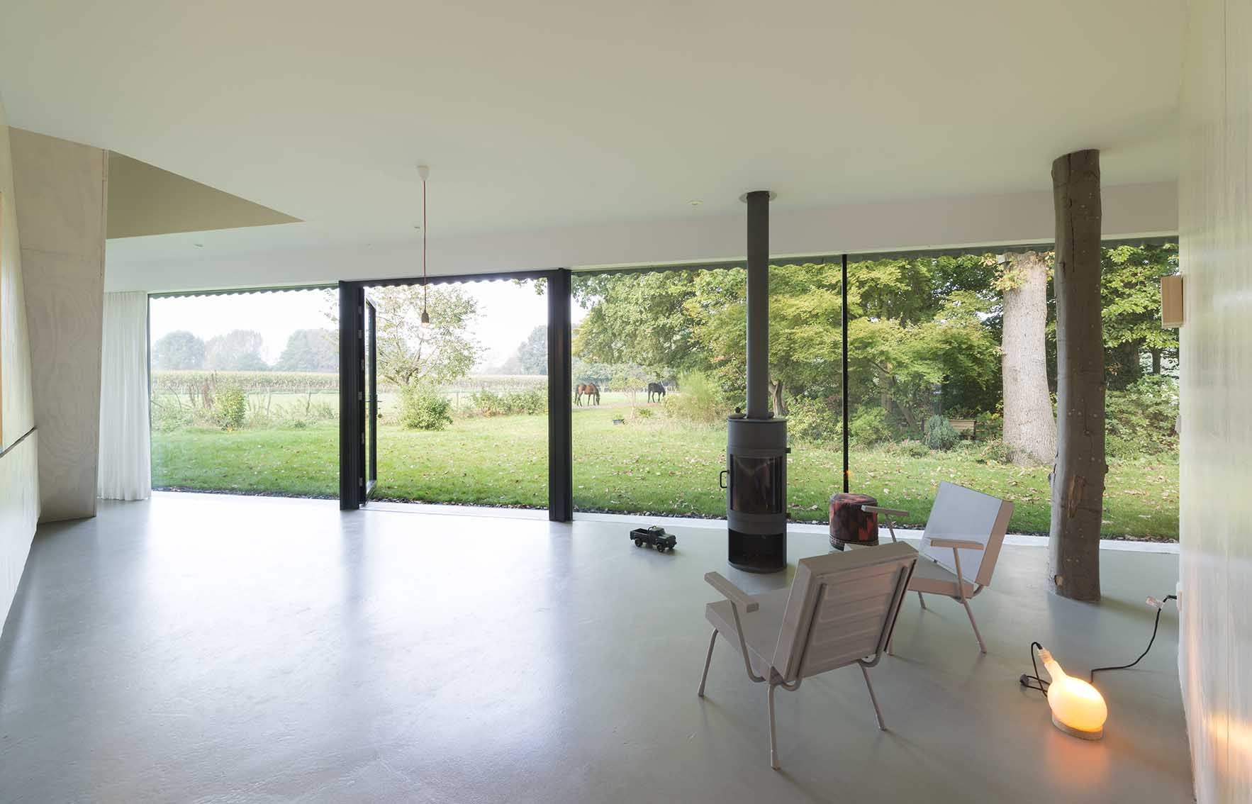 Esta pequeña casa en el campo se ha diseñado alrededor de una ventana panorámica a lo largo con una vista al jardín y al paisaje circundante. En 17,5 metros de largo, de piso a techo, el tramo de vidrio desdibuja el límite entre el interior y el exterior. El bastidor longitudinal guía al ojo en un “paseo” por el paisaje; un grupo denso de árboles desde cerca y fuera los campos agrícolas más alejados.