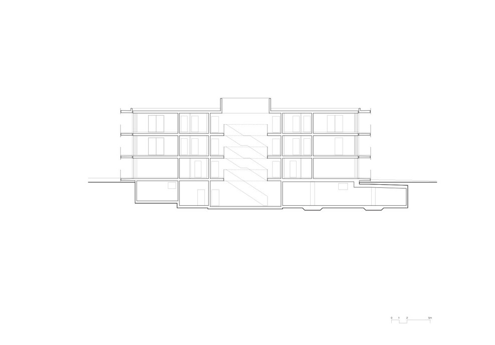 The floor plan is organized concentrically on four floors around a central, light-filled stairwell. A layer of bathrooms, storage and hallways on the top three floors forms a mediating layer between the outer rooms and the central circulation. Each apartment opens onto a balcony with two sides. Despite the fully-glazed facade, the building achieves the required level of energy efficiency due to the compact organization of the plan.