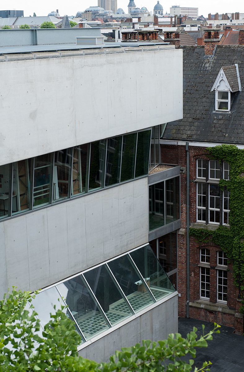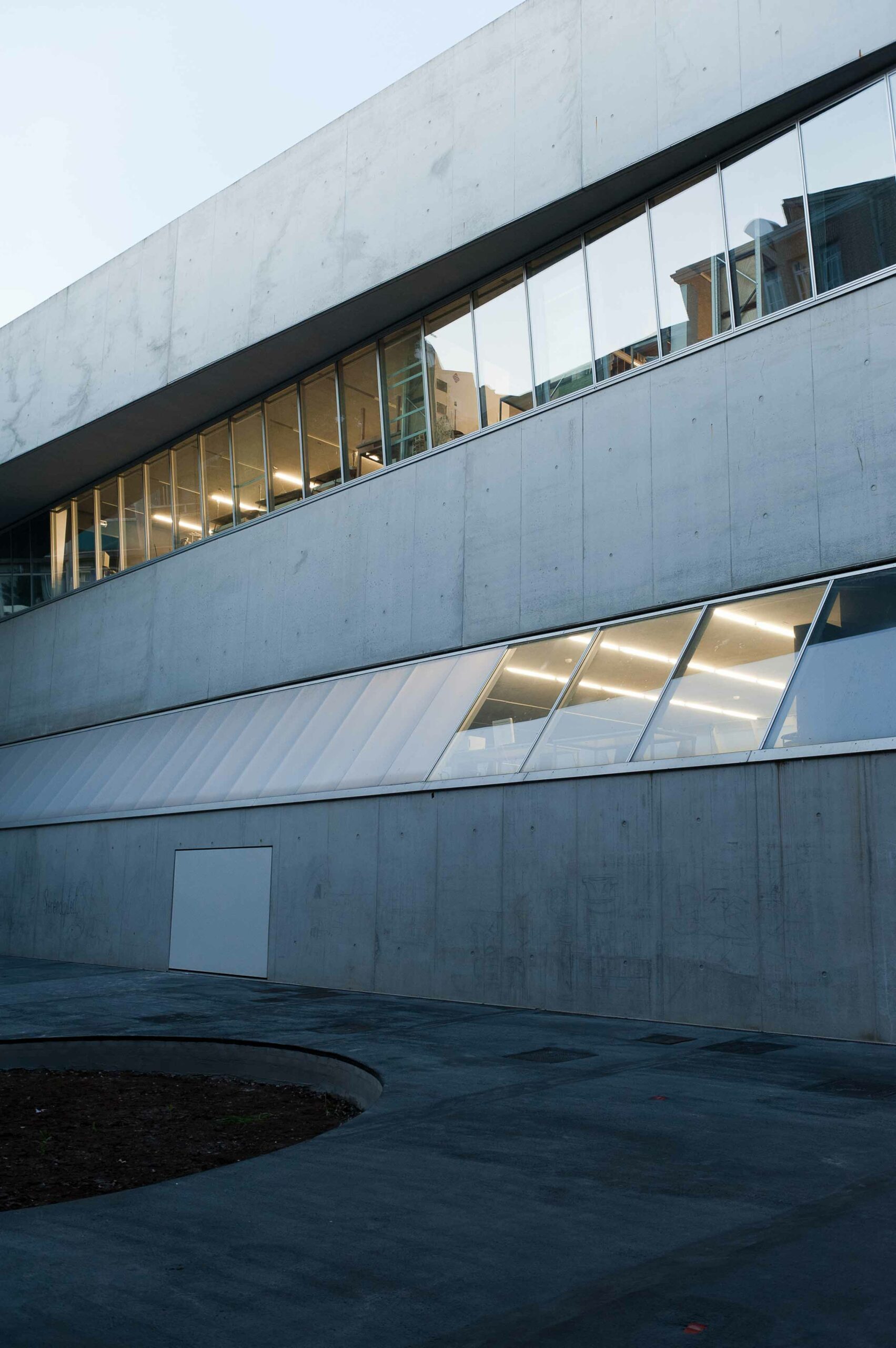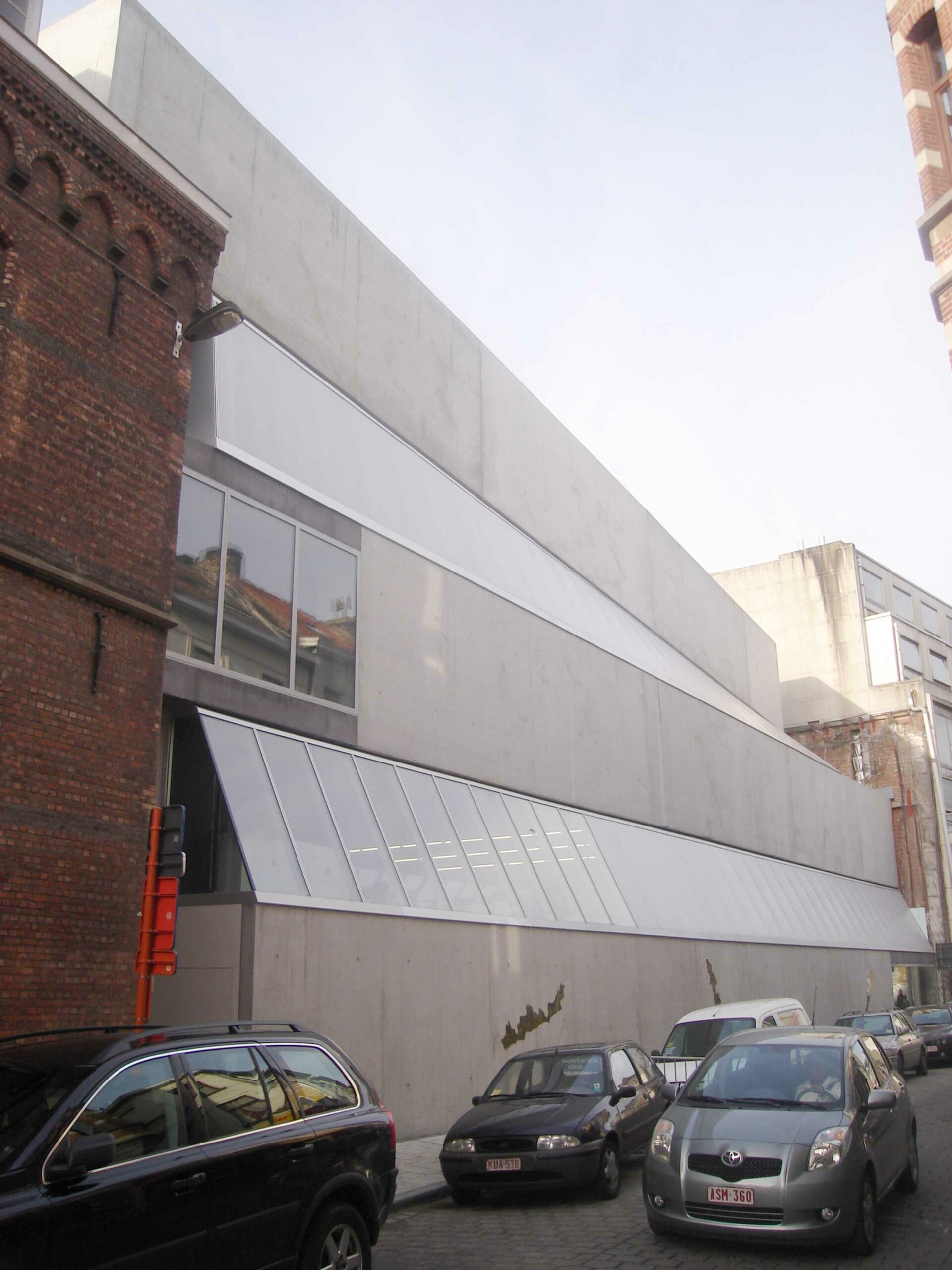 The workshop building is also an autonomous form based on a piling of horitzontal, alternating, opaque and translucent volumes. It is a building shape simultaneously by its program, by urban rules and by its context. It is an irregular stacking of rectangulars massive volumes with intermediate translucent parts providing zenithal light to the work stands.