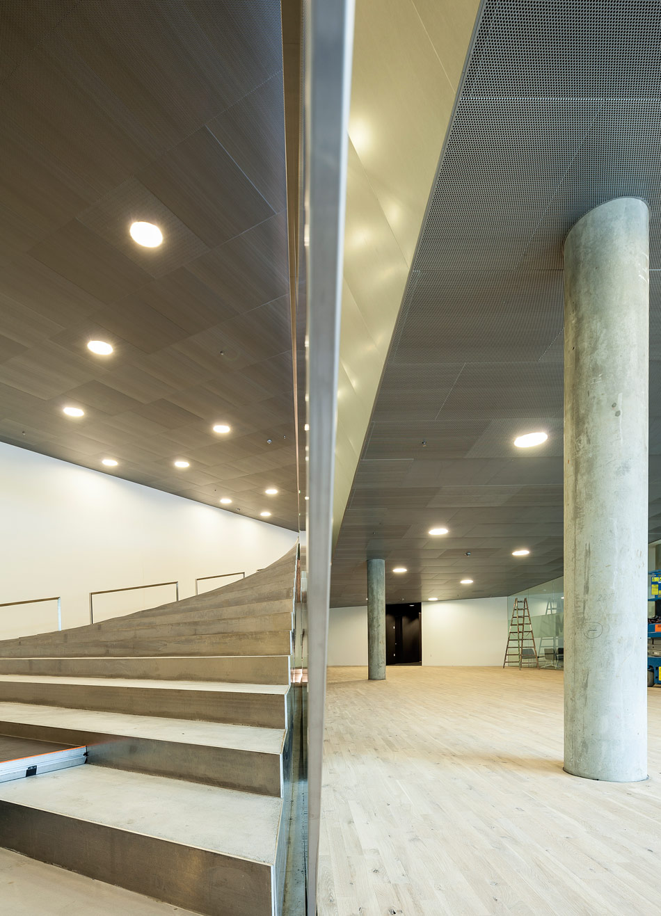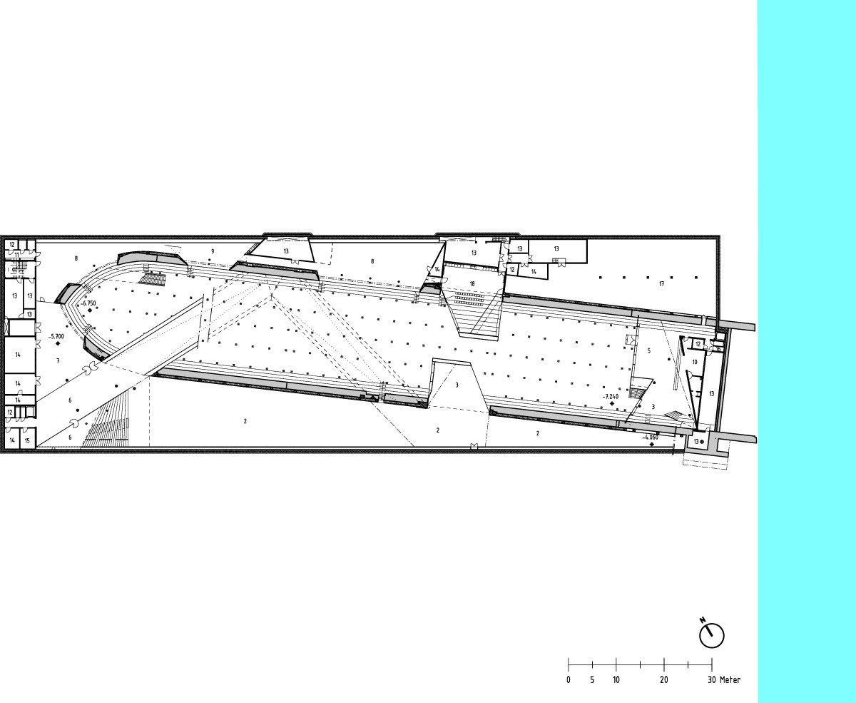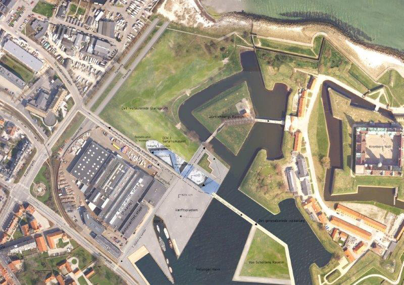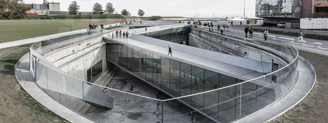 A series of three double-level bridges span the dry dock, serving both as an urban connection, as well as providing visitors with short-cuts to different sections of the museum. The harbor bridge closes off the dock while serving as harbor promenade; the museum’s auditorium serves as a bridge connecting the adjacent Culture Yard with the Kronborg Castle; and the sloping zig-zag bridge navigates visitors to the main entrance. This bridge unites the old and new as the visitors descend into the museum space overlooking the majestic surroundings above and below ground. The long and noble history of the Danish Maritime unfolds in a continuous motion within and around the dock, 7 meters (23 ft.) below the ground. All floors – connecting exhibition spaces with the auditorium, classroom, offices, café and the dock floor within the museum – slope gently creating exciting and sculptural spaces.