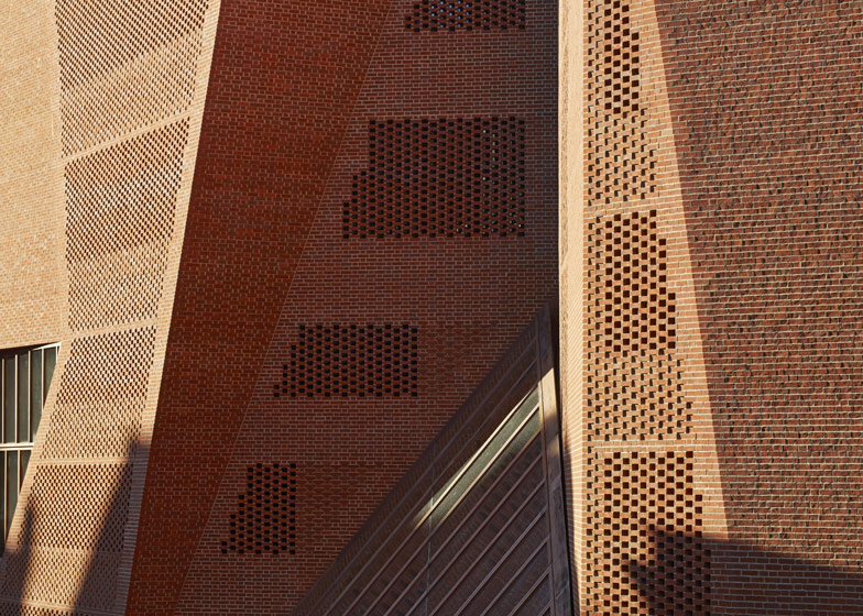 The bold red brick tower is made of not just any brick – there are 46 standard shape bricks, 127 special bricks out of a total of 175,000, and not a single cut brick. This is achieved with walls that slope and become perforate to give shading and have angles that vary in every direction all suggesting a very considerable imaginative control. The latticing lets in more light, lending it a Kahnian air. The windows use jatoba, a self-finished hardwood from Brazil and have a complexity of their own whereby many verticals are gathered together next to larger panes, the verticals indicating opening lights.