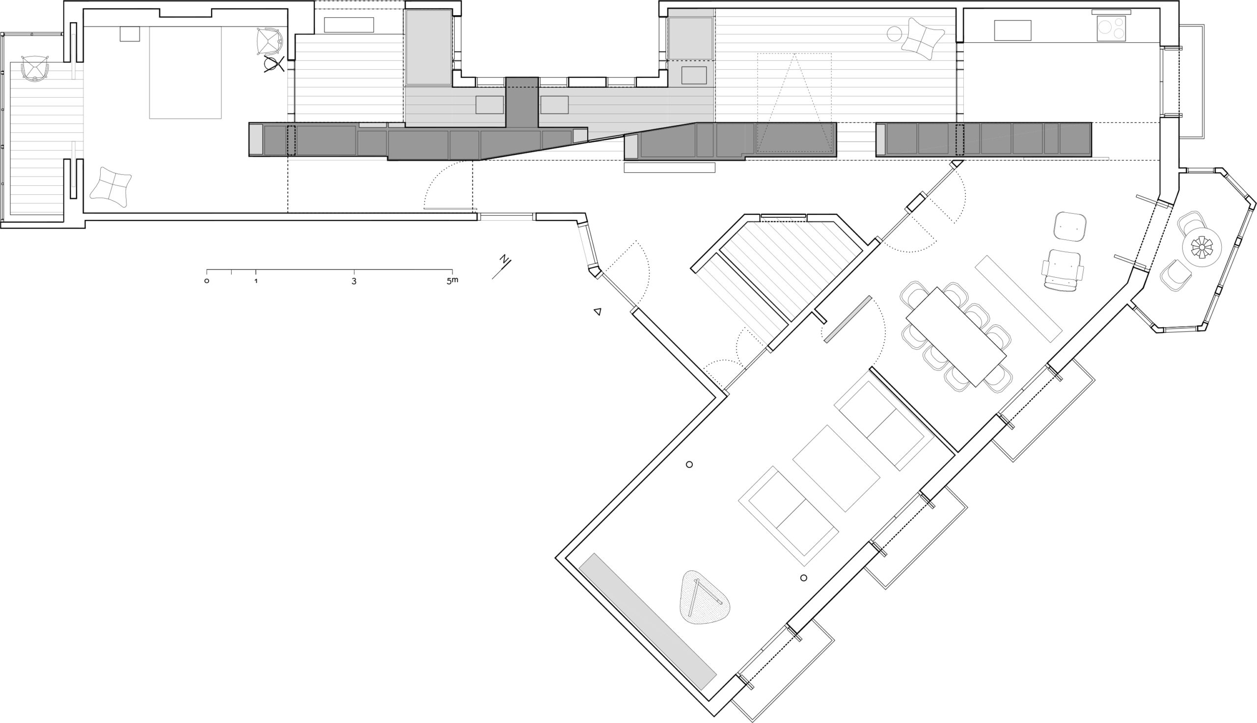 El mueble crece sólo hasta 2,34m de altura en lo que entendemos como la cota más doméstica, íntima y humana por debajo de los monumentales techos de inicios del siglo XX y dejando así que la luz fluya entre las estancias por encima del volumen central. Es justo en este momento, entre techos y suelos, cuando se interpone la verdadera clave del proyecto: una finísima chapa de hierro negro que remata el volumen de roble cerrando y acotando el espacio para permitir la nueva distribución al margen del ritmo preestablecido de alfombras y cornisas. Así el espacio se pliega, se comprime, se abre y dilata en función de las demandas del proyecto. Ya no es necesario recurrir a puertas o paredes ya que el usuario percibe y comprende las tres zonas de la casa a medida que recorre el espacio alrededor del mueble central dejándose llevar por el juego de niveles y quiebros que ofrece la chapa de hierro y el volumen de madera. Así el traspaso entre las áreas públicas y las habitaciones o el espacio servidor siempre se produce a través de un umbral bajo el hierro. O igualmente, los aseos y duchas se concentran bajo la chapa adosándose al único patio interior que sirve para iluminar y ventilar de forma natural.
