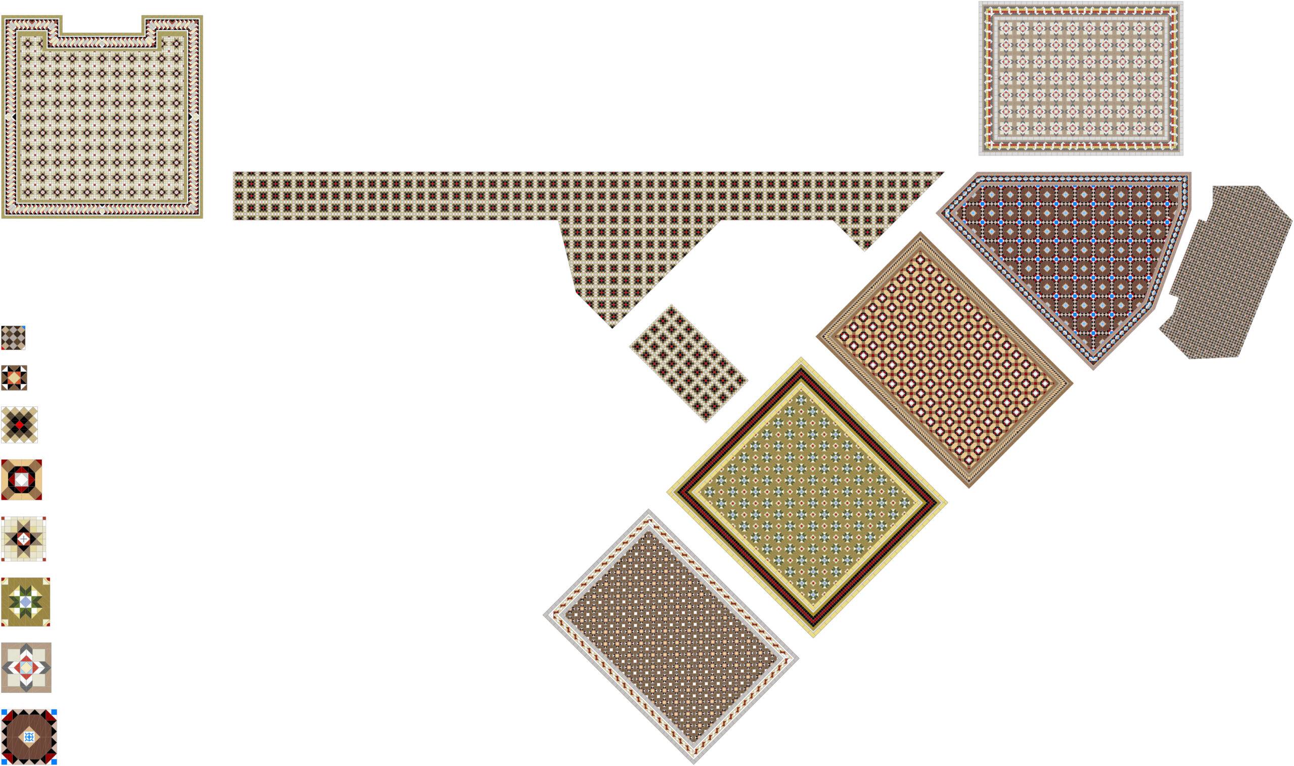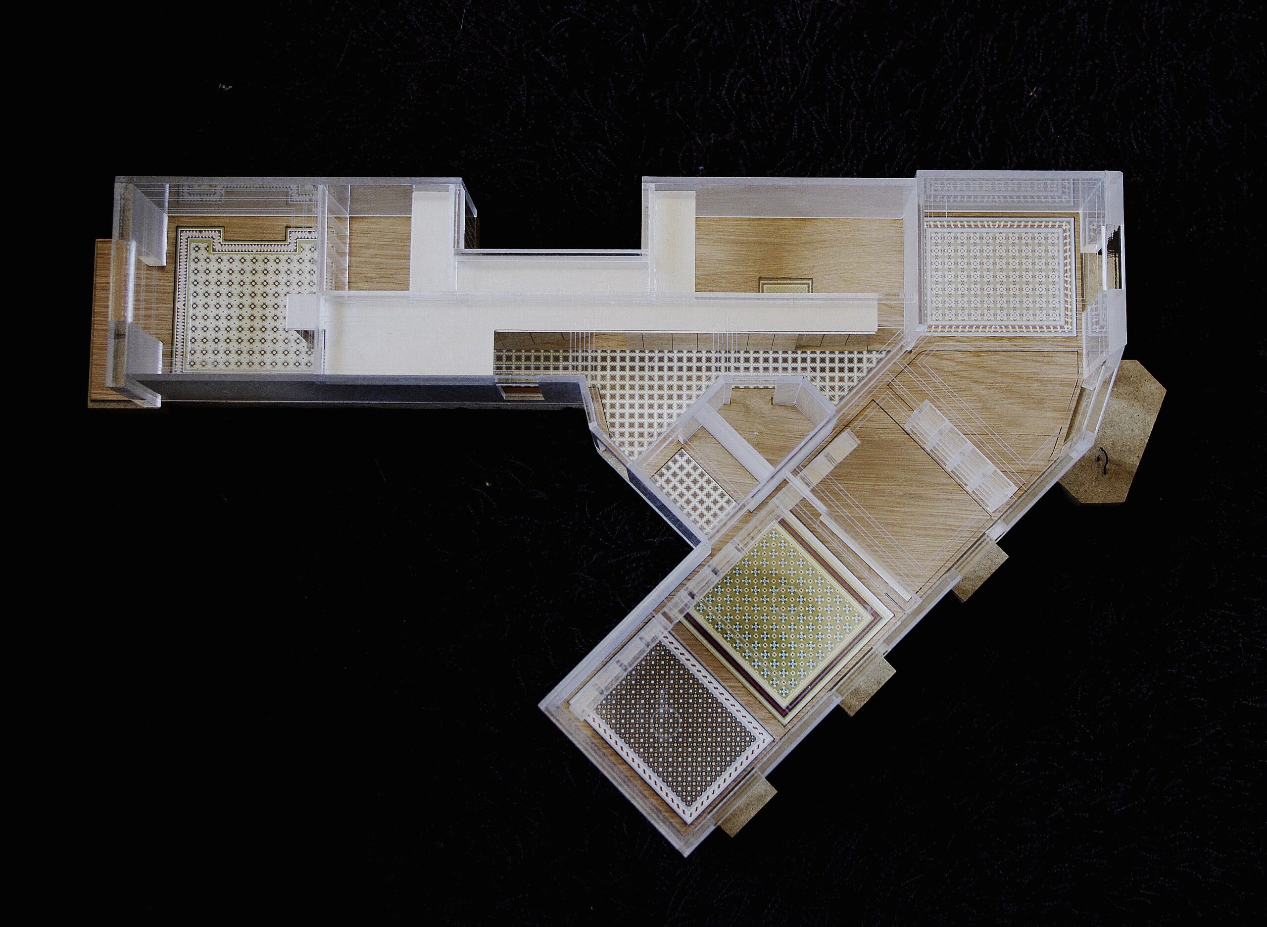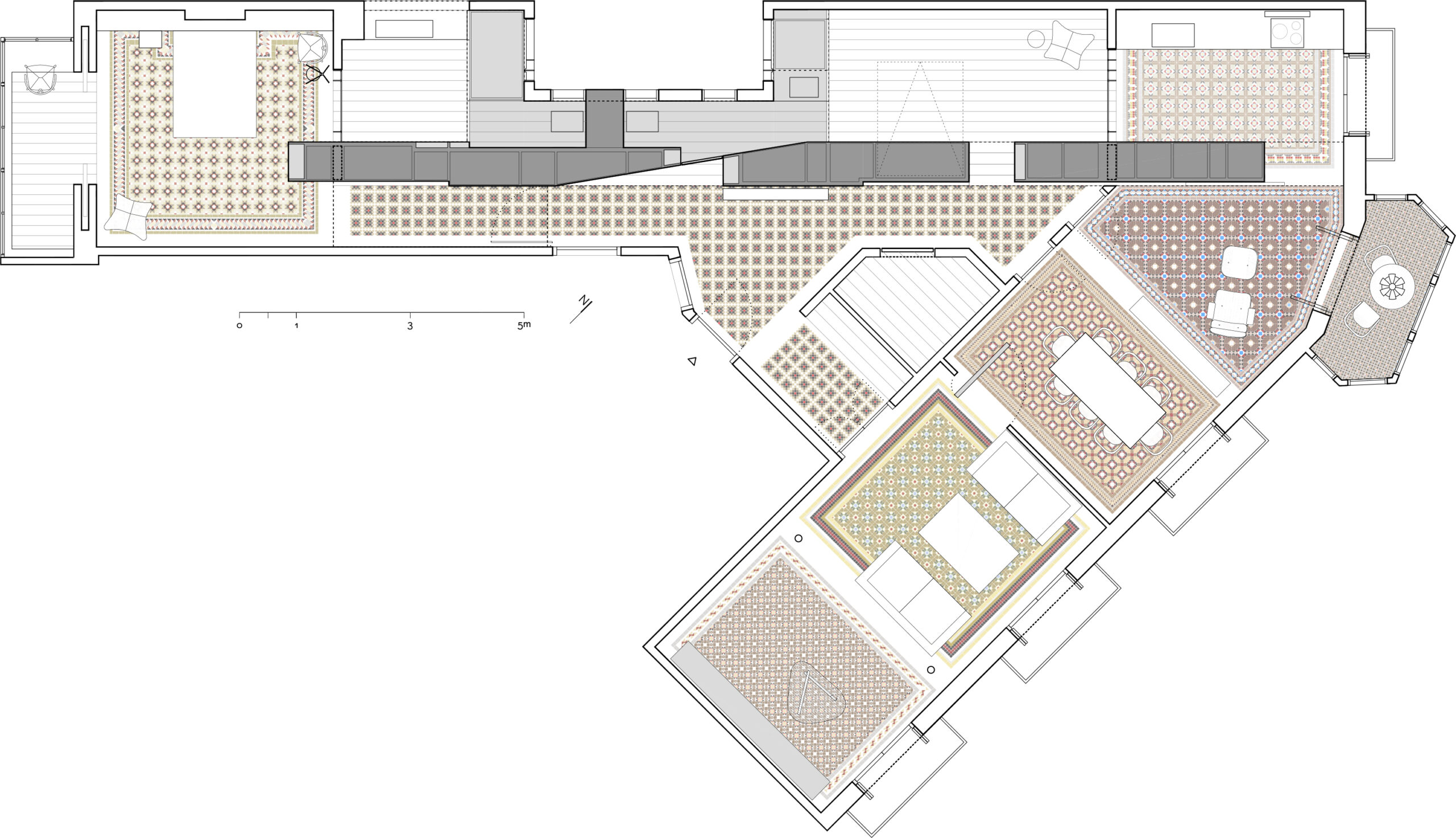 La propuesta recupera y enaltece tanto mosaicos originales modernistas como techos altos de molduras de yeso. El proyecto enmarca cada mosaico restaurado rodeándolo mediante parquet de roble natural a modo de alfombras de colores engarzadas en el pavimento. De esta base perimetral de madera, por donde se han pasado todas las instalaciones de calefacción, agua y electricidad, surge y se levanta el mueble central como una gran escultura que se quiebra y retranquea buscando alineaciones precisas con el parquet y volando sin pisar en ningún momento los mosaicos. Cada gesto pretende activar el espacio adyacente al mueble central, dotándolo de usos y actividad para evitar la pérdida de espacio. Ya no importa la pieza como volumen, sino el espacio vacío que se forma entre el mueble y las paredes medianeras del perímetro del piso.