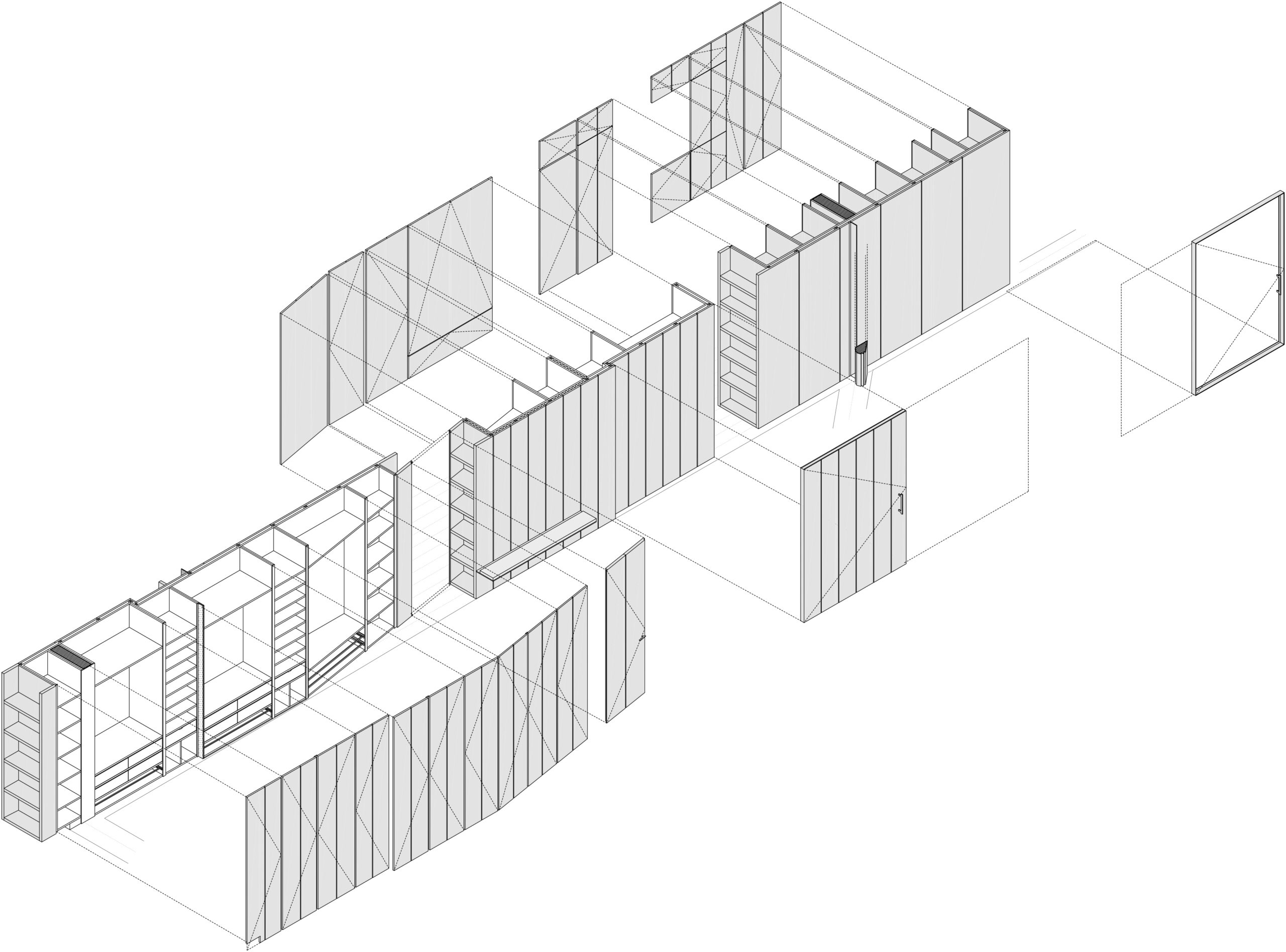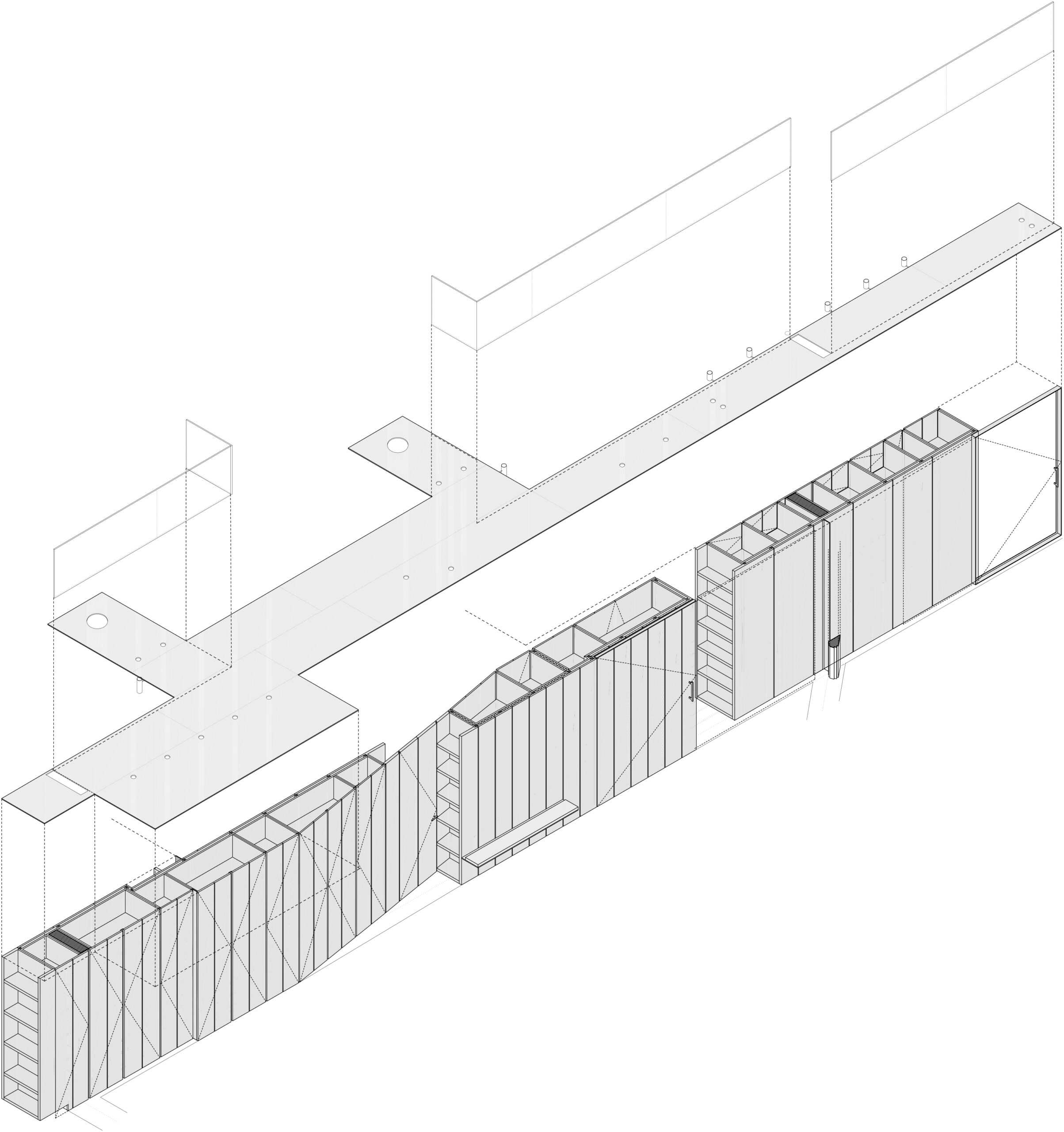 El proyecto desdibuja el pasillo central repleto de puertas y distribuidores, elemento éste característico de los pisos del Ensanche, para unificar al máximo todo el espacio alrededor de un mueble vertebrador que hace las veces de biombo entre lo público y lo privado. Simultáneamente esta nueva espina dorsal acomoda el almacenamiento del piso al tiempo que organiza y distribuye la planta en tres zonas diferenciadas.