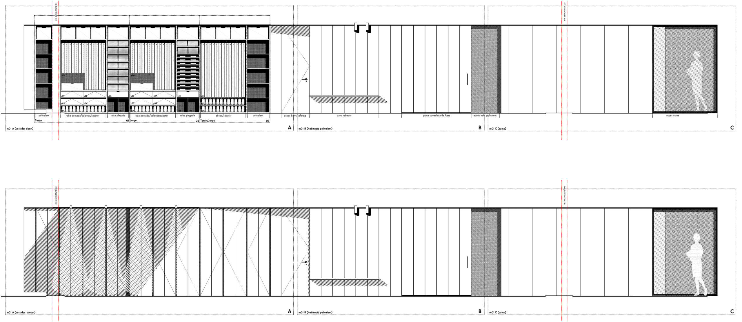 De la misma manera que el mueble central concentra todos los armarios y el espacio de almacenamiento que requiere el proyecto, incluyendo una cama plegable, la ropa blanca, la columna de hornos, la lavadora y secadora o la nevera, es la fina capa de hierro la que permite y soporta cada una de las puertas y mamparas que solicita la nueva distribución. Puertas correderas de cristal y madera, pivotantes a modo de puertas o mamparas para las duchas así como un gran espejo en la zona del vestidor, la chapa permite todos los herrajes necesarios así como el soporte de los cristales hasta las molduras, evitando así distorsiones entre aquello que es original con lo que es estrictamente nuevo.