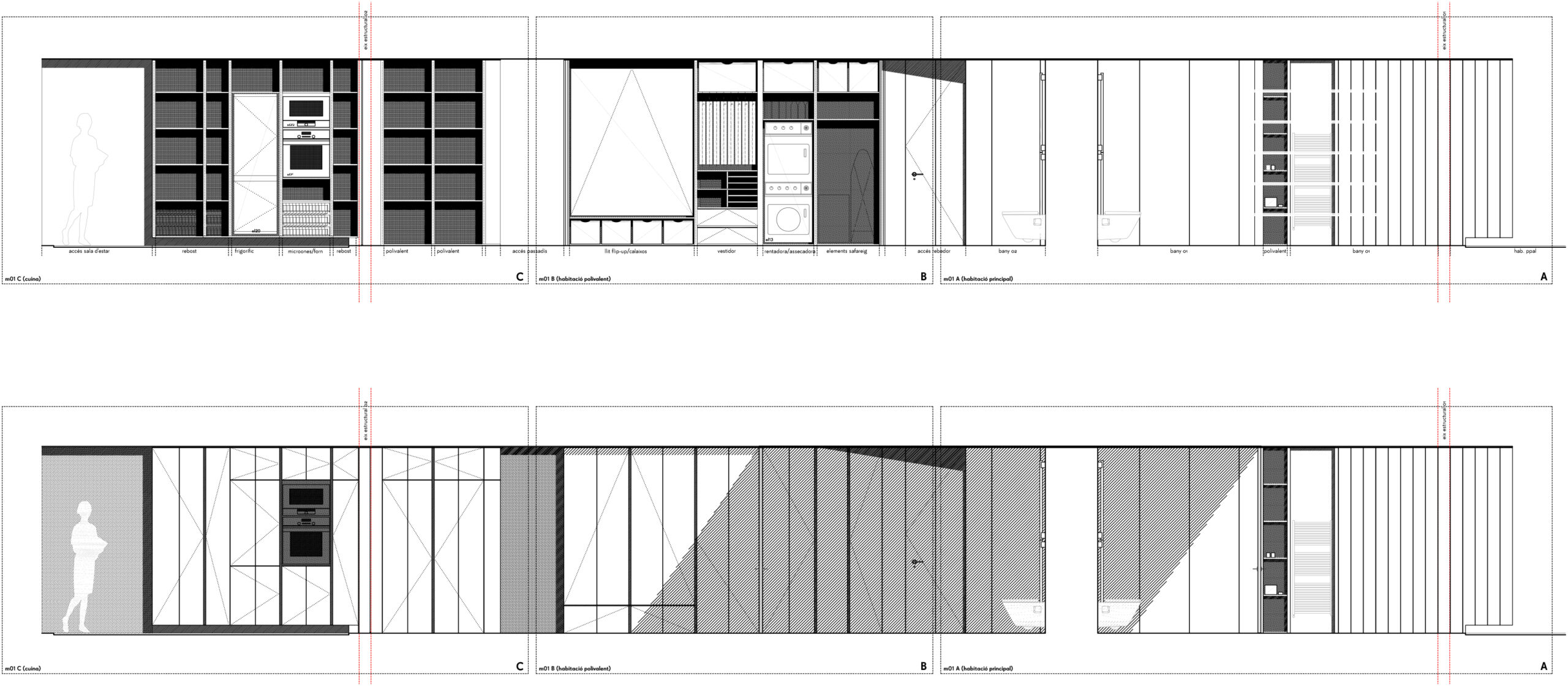 Concentrar la intervención en un único volumen continuo a modo de espina dorsal que atraviesa la planta, nos permite liberar completamente el perímetro. Es precisamente esa yuxtaposición de células regulares, repletas de mosaicos coloridos, molduras de escayola y puertas exuberantes labradas en pino y vitrales, el valor flexible y polivalente de los pisos del Ensanche. Esa característica que permite adaptar la distribución a lo largo del tiempo en función de las necesidades vitales. Así la casa se ofrece como lienzo en blanco para disponer fácilmente los muebles, los cuadros, las obras de arte, los objetos y recuerdos familiares acumulados a lo largo de toda una vida, que se podrán organizar e intercambiar libremente sin estar cohibidos y forzados por el nuevo proyecto.