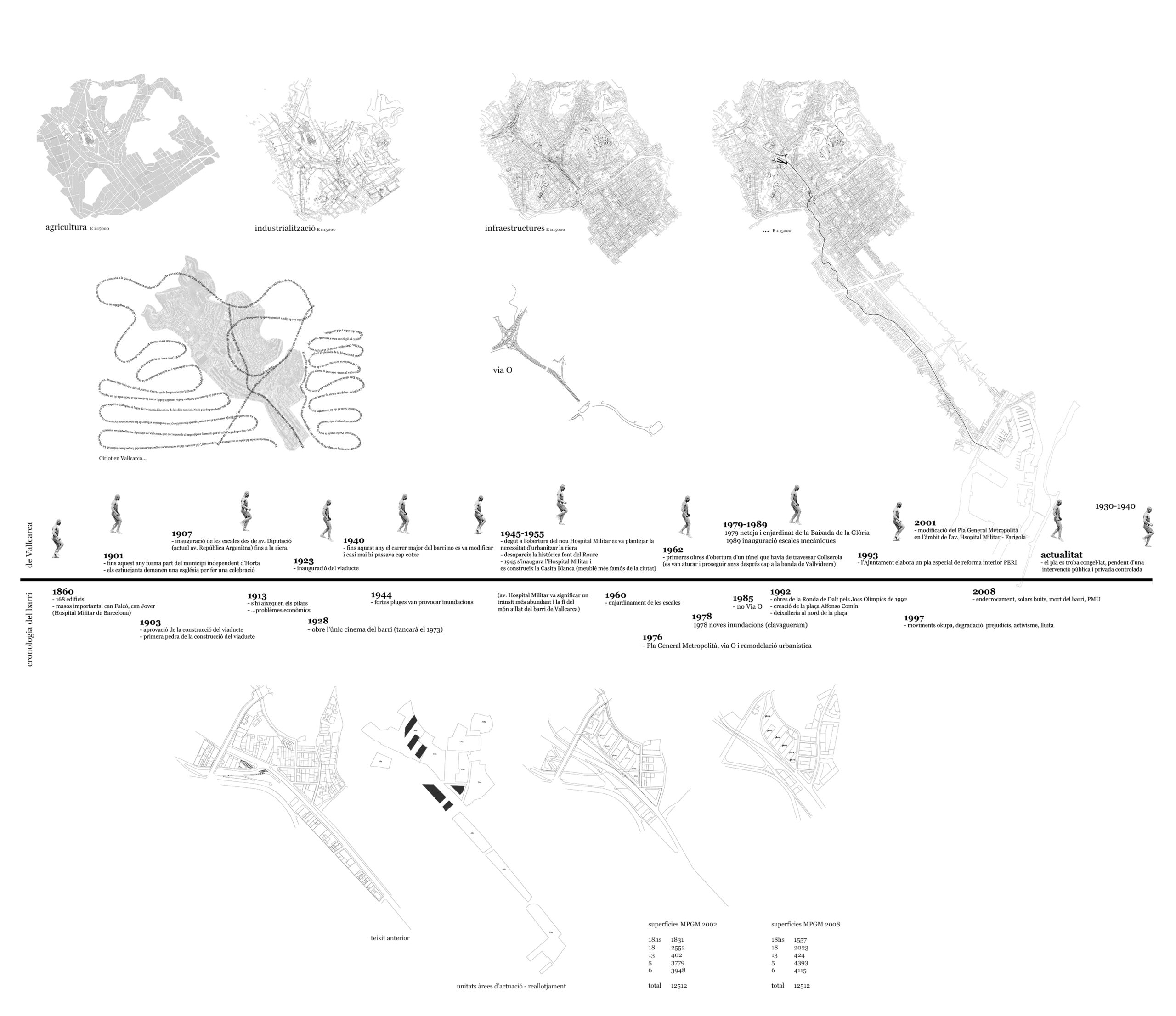 Este barrio ha sufrido una degradación programada desde que quedara afectado por el PGM de 1976 que planeaba el paso de una gran infraestructura interurbana (via O), modificado posteriormente. Siguió un urbanicidio gestado entre promotoras, constructoras y ayuntamiento, y una oportunidad ahora de actuar en un tiempo y cambio variado.